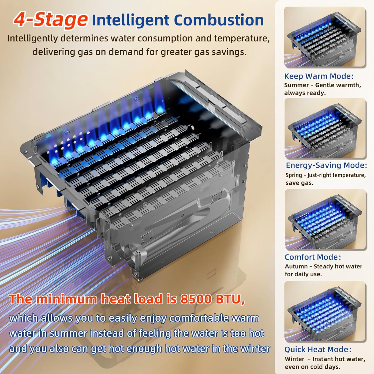 【4-stage Energy-saving Combustion Technology】: The burner in the gas on demand hot water heater uses intelligent staged combustion technology, with a minimum heat load of only 8500 BTU, which allows you to easily enjoy comfortable hot water in the summer without adding extra cold water, and you also can get hot enough hot water in the winter