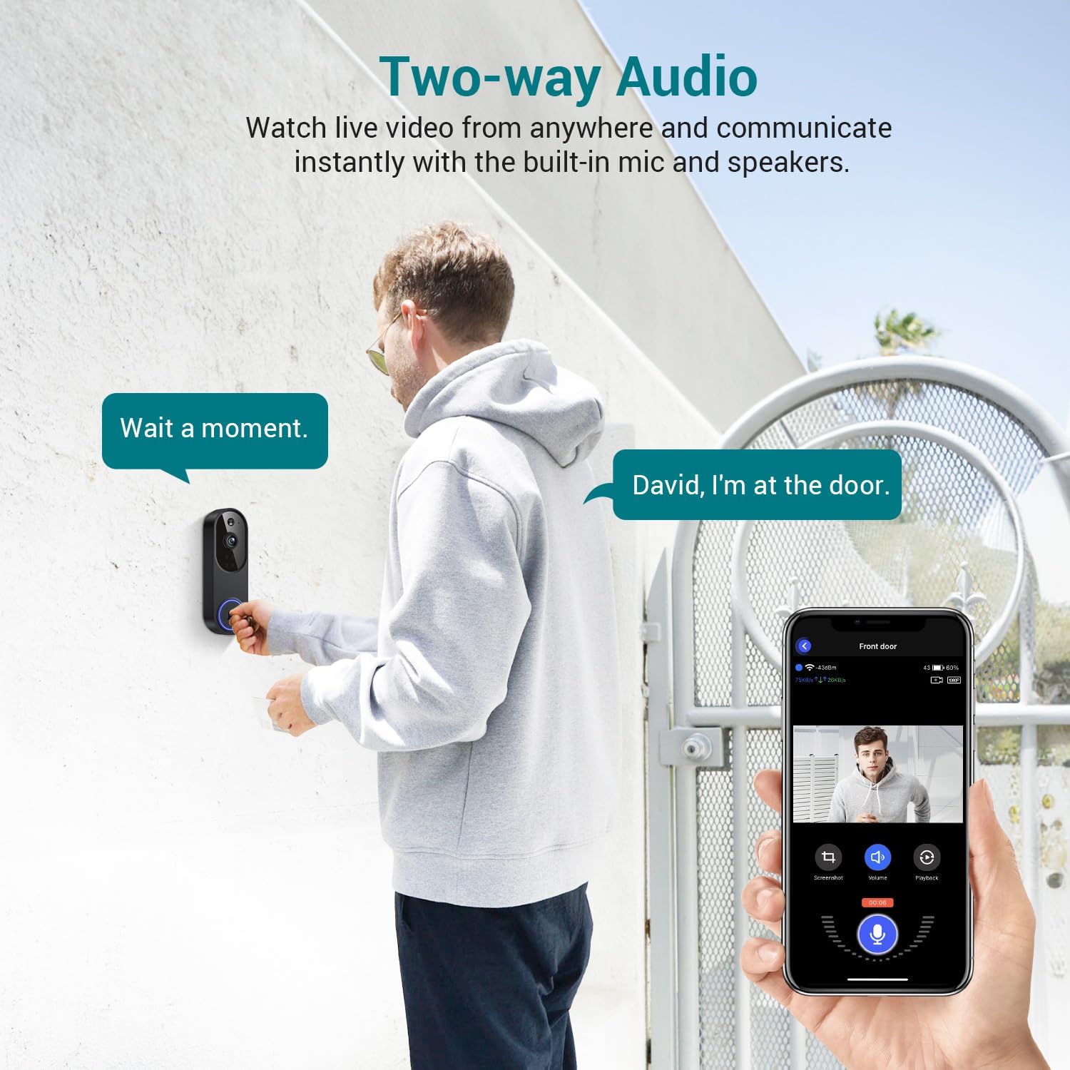 Talk to Visitors from Anywhere: Two-way audio lets you greet guests or manage deliveries, no matter where you are.