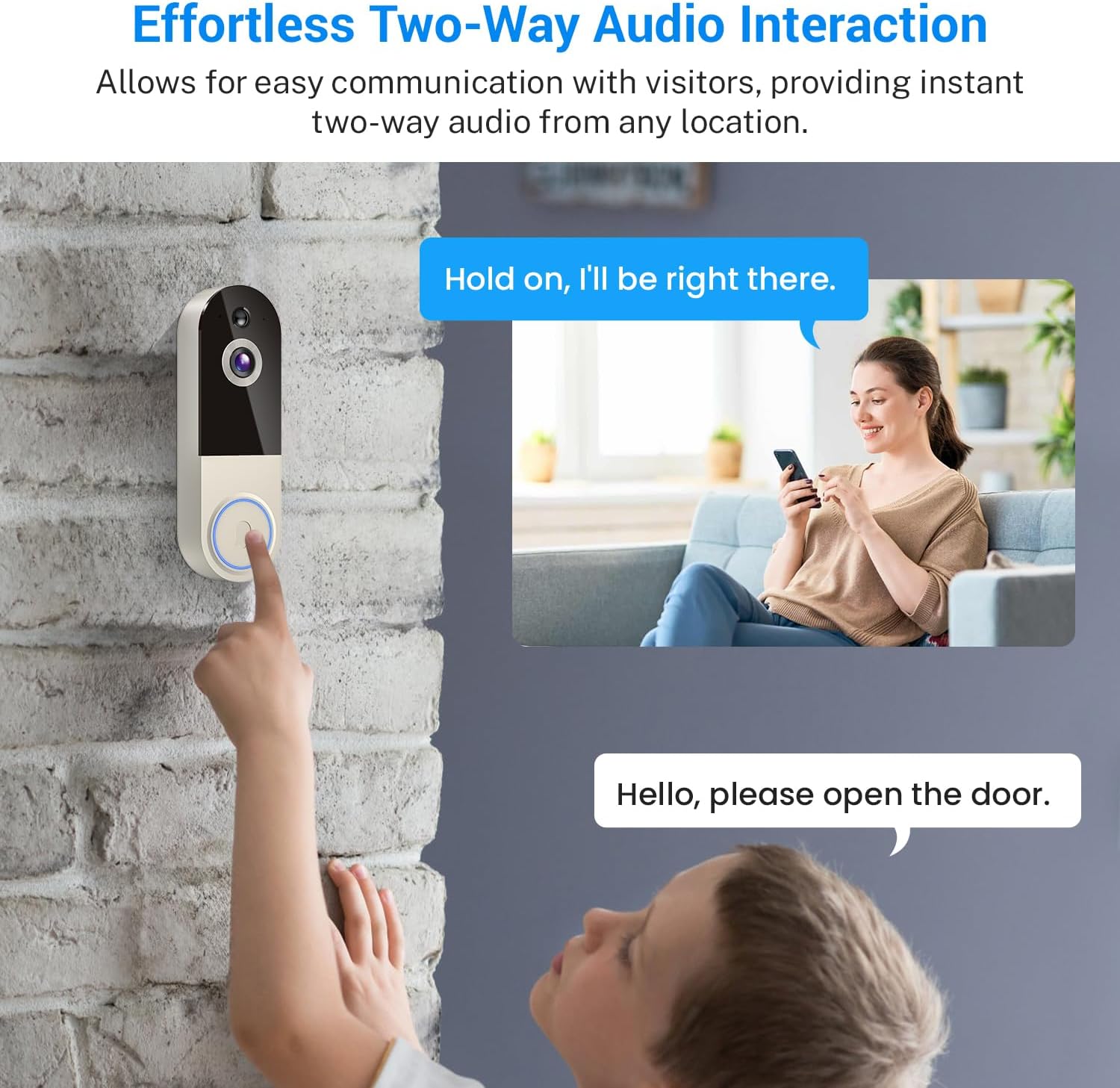 Real-Time Two-Way Audio Interaction: Enables direct voice communication with visitors from anywhere, facilitated by live two-way audio.