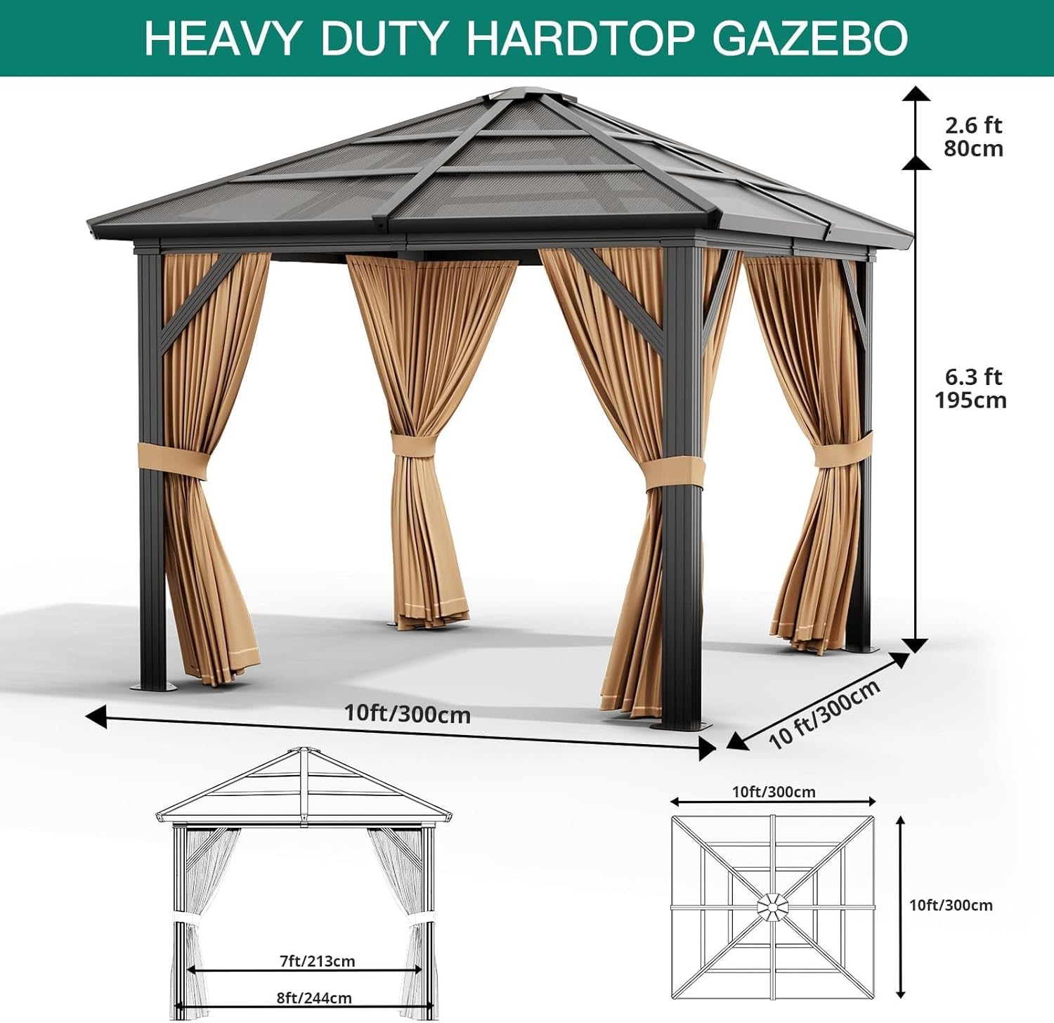 Spacious & Multipurpose Outdoor Shelter: With dimensions of 10′ x 10′ x 9.1′, this spacious gazebo comfortably fits 6–8 people—perfect for BBQs, parties, or as a parking shed.