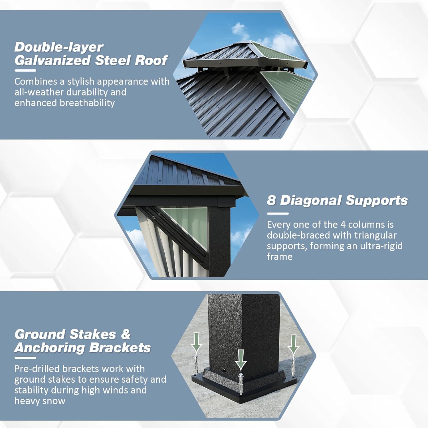 [ GALVANIZED STEEL ROOF ] – This hardtop gazebo features a double-layer galvanized steel roof designed to offer shade and shelter from sun and rain. The structure helps reduce fading over time. The double-tier design allows airflow to support heat dissipation and comfort in various weather conditions