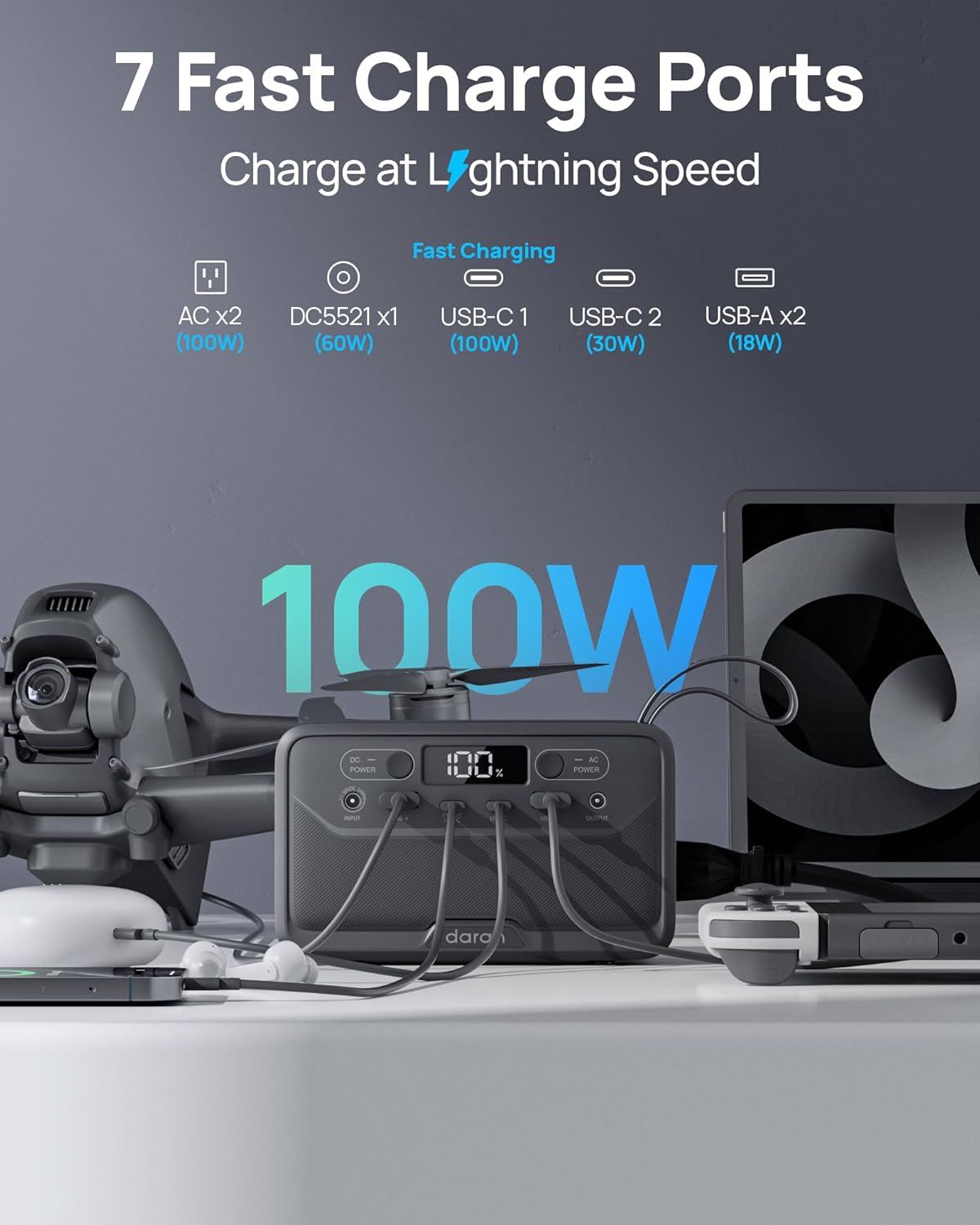 ใ€๐Ÿ• ๐๐จ๐ซ๐ญ๐ฌ ๐”๐ฉ ๐ญ๐จ ๐Ÿ๐ŸŽ๐ŸŽ๐–ใ€‘: Dual USB-C & Dual USB-A fast charging ports allow you to power up to 4 digital devices like smartphone, laptop, camera, tablet and drone simultaneously. Features dual 100W AC outlets for multiple small camping appliances as fans, mini-fridges, and LED lights. Stay power connected anywhere, anytime. Clear LED display for status and power monitoring, Remove protective film before use. (Two-Way USB-C1 IN/OUT=65W/100W, USB-C2 30W, USB-A1 18W, USB-A2 18W, DC5521 60W, ACx2 100W, total 7 outlets).