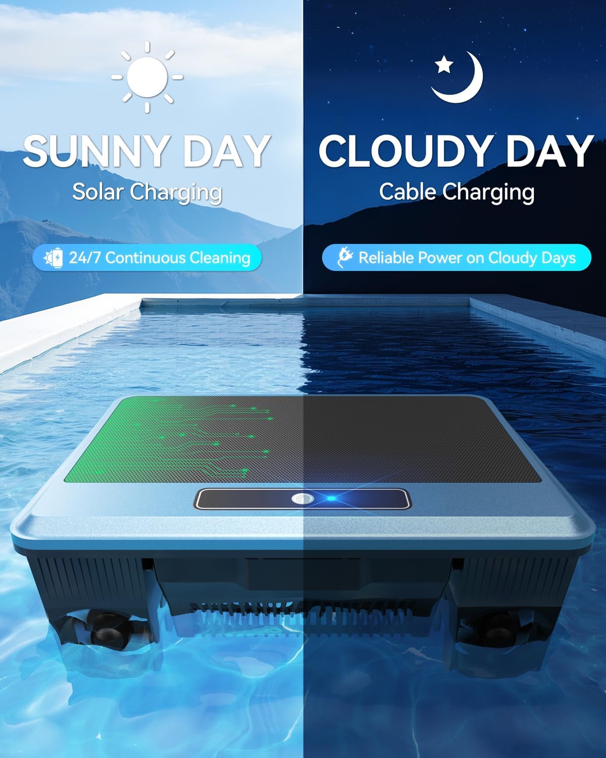 ALL DAY CONTINUOUS CLEANING: Our solar pool skimmer adopts Newly upgraded solar charging Provides continuous optimal 24/7 cleaning results; A single charge via the adapter can keep your skimmer running for up to 20 hours; it can be used whether it is raining or cloudy
