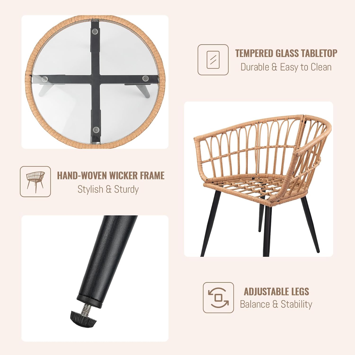 3 Piece Patio Bistro Set, Outdoor Wicker Apartment Balcony Furniture Set, All-Weather Rattan Patio Conversation Set for Backyard, Balcony and Porch with Soft Cushions, Tempered Glass Side Table(Beige)