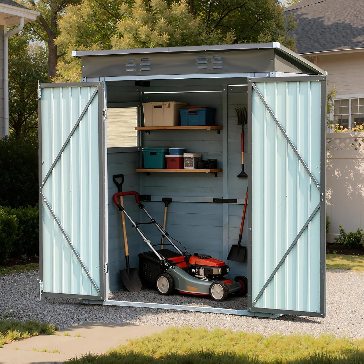 Secure, Easy Access with Lockable Double Hinged Doors – Enjoy convenient, walk-in access for large items through the wide double hinged doors (44.49″ W x 62.6″ H). The integrated lockable door offers enhanced security and peace of mind, a significant upgrade over the basic, less secure hasps found on many competing sheds, ensuring your valuables are always safe