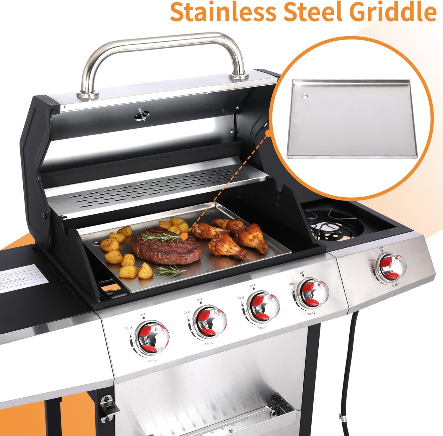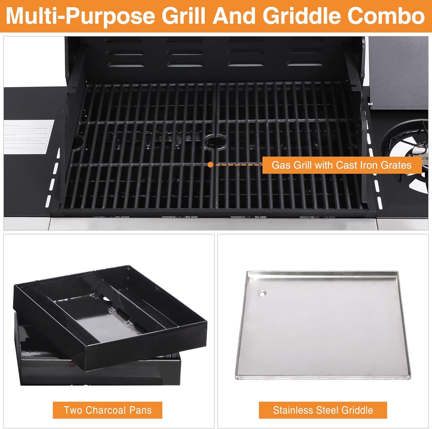 4-Burner Propane Gas Grill with Side Burner & Charcoal Trays | Dual Fuel Outdoor Grill Combo with Cast Iron Grates & Stainless Steel Griddle | 448 sq. in. Cooking Area for Backyard BBQ