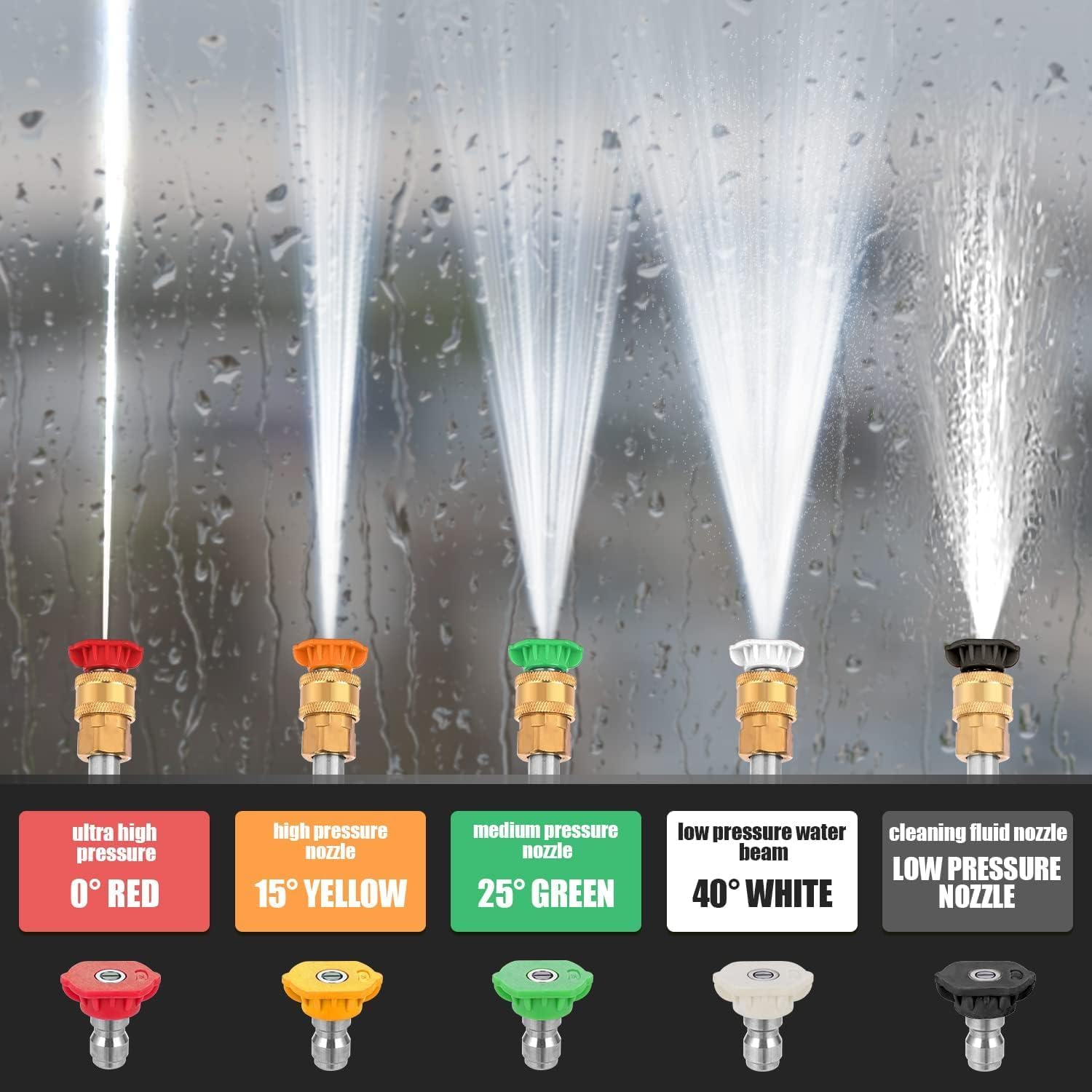 0° (Red): A focused and powerful stream effectively removes stubborn stains and debris.15°(Yellow): Washing fences, moss and other places that are easy to clean.25° (Green): Medium-angle spray for detailed cleaning tasks.40°(White): Ideal for washing driveways as the final step in cleaning.Soap Nozzle (Black): This nozzle is designed to be used specifically with low-pressure detergent. Use this nozzle only when applying detergent.