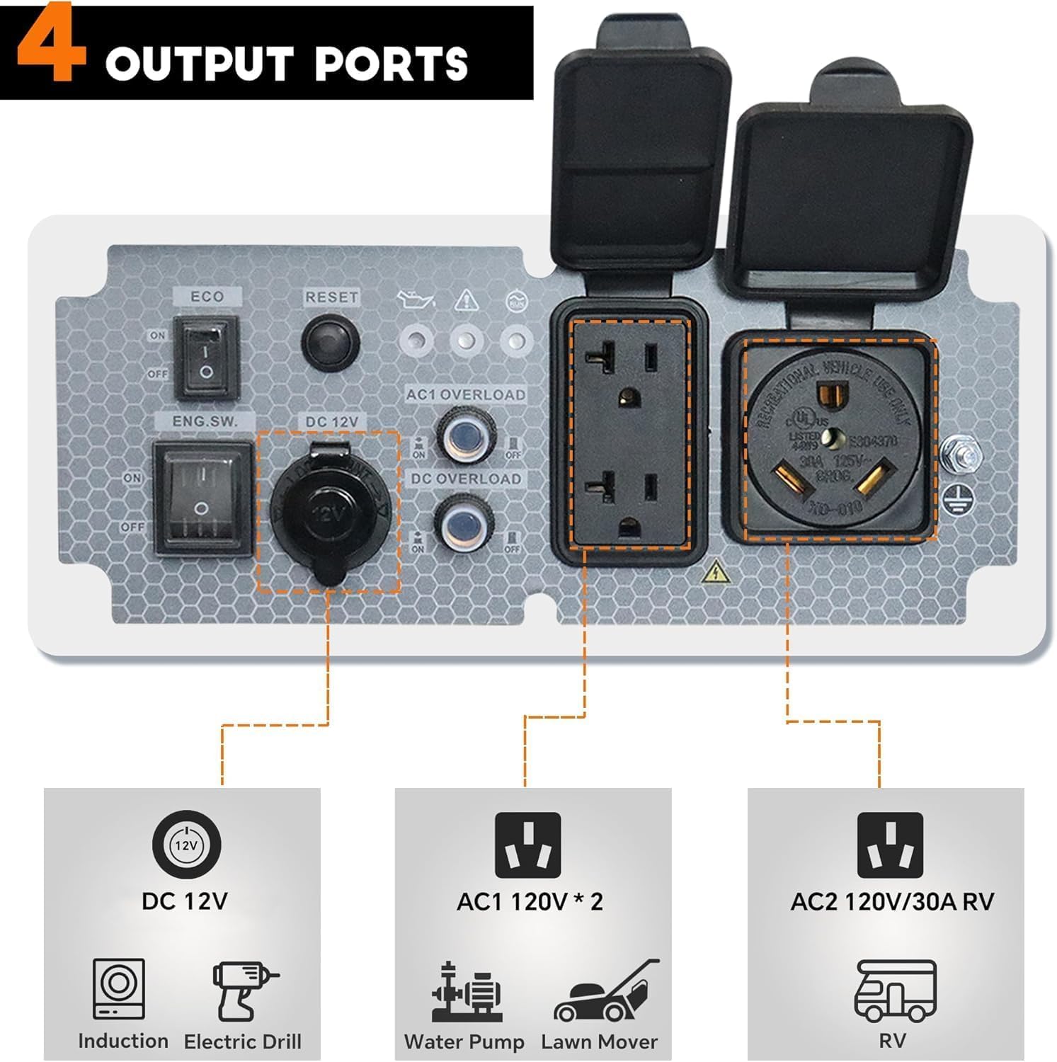 1 × DC 12V outlet for charging batteries or powering small DC devices; 2 × AC 120V household outlets (NEMA 5-20R) for tools, appliances, and home backup;1 × AC 120V / 30A RV outlet (TT-30R) designed for RVs and camping use.