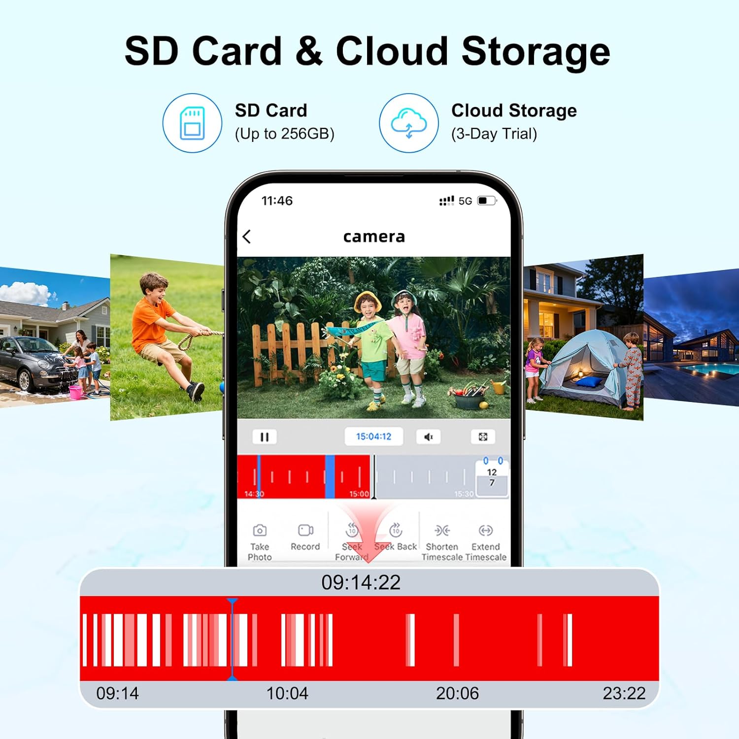 PIR Motion Detection & Auto Tracking: Equipped with a sensitive built-in PIR sensor that effectively minimizes false alarms triggered by animals or wind. Upon detecting a moving object, the cameras for home security activates auto-tracking and sends real-time notifications to your phone. Supports customizable detection zones to focus only on critical areas, reducing redundant alerts.