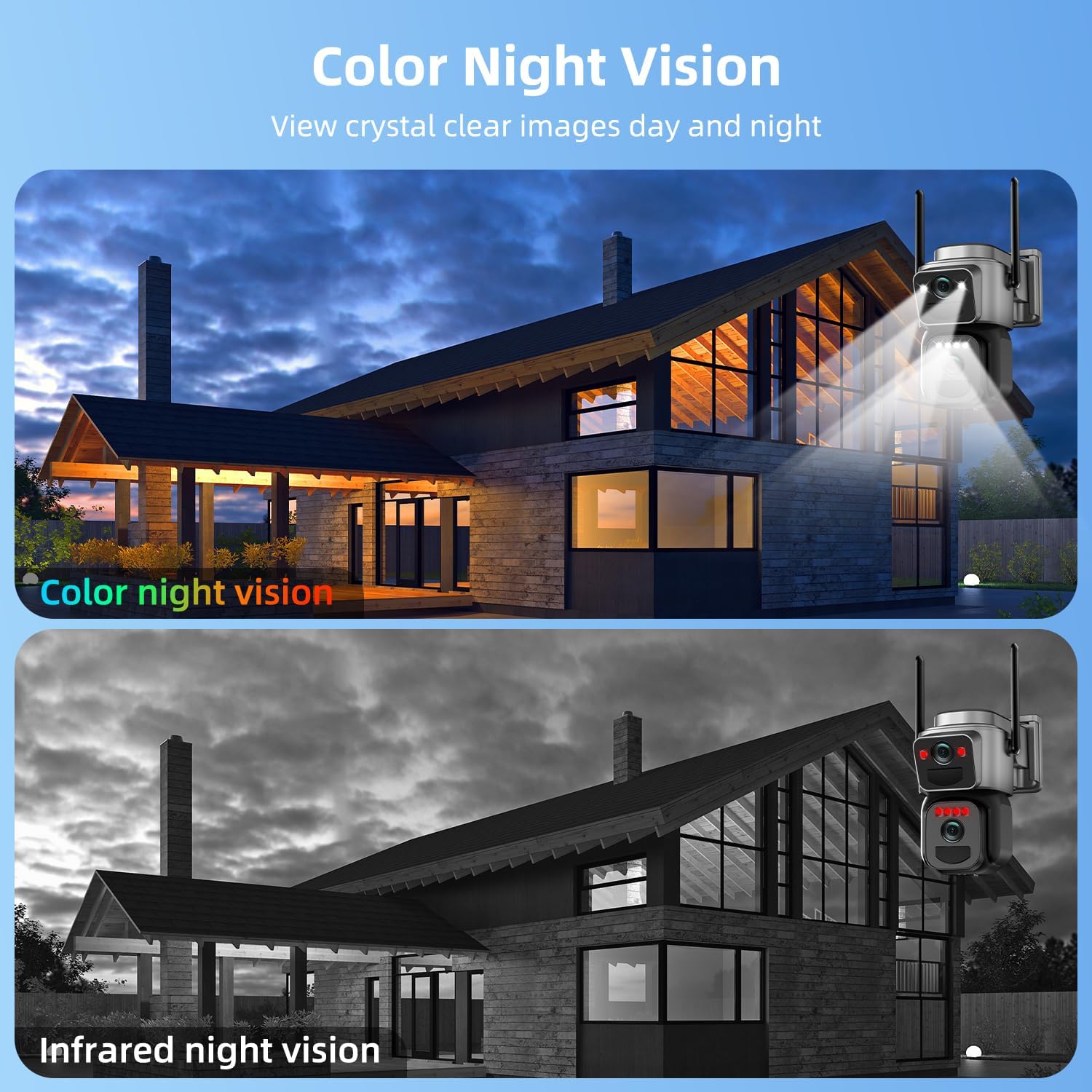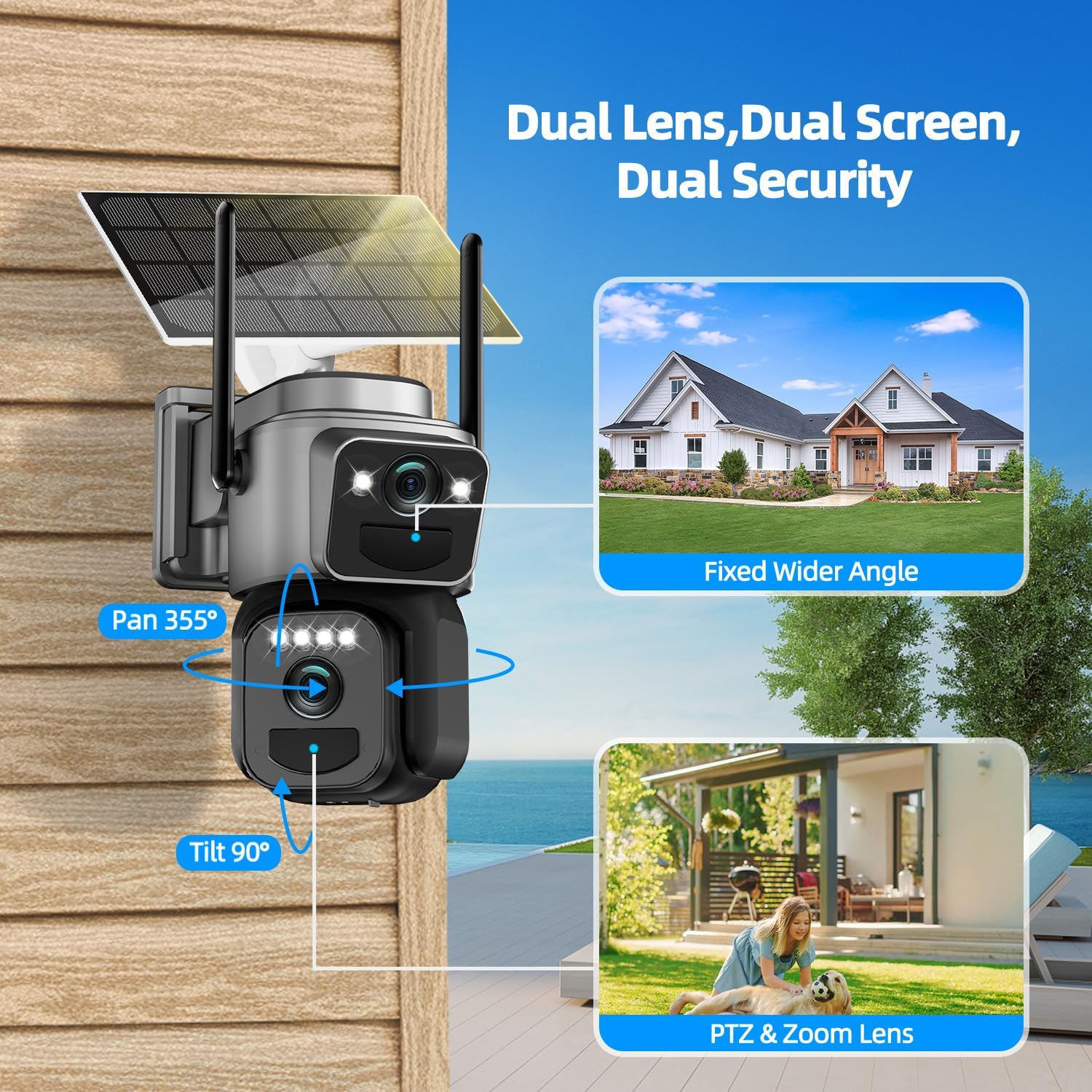 【Dual Lens & 360° View】This Outdoor security camera are designed with dual lenses (Bullet&PTZ), the upper fixed lens for key area monitoring, the lower PTZ lens supports 360° horizontal and vertical 90° rotation, providing you with 360° full protection with few blind spots. Always protect your belongings and family safe.
