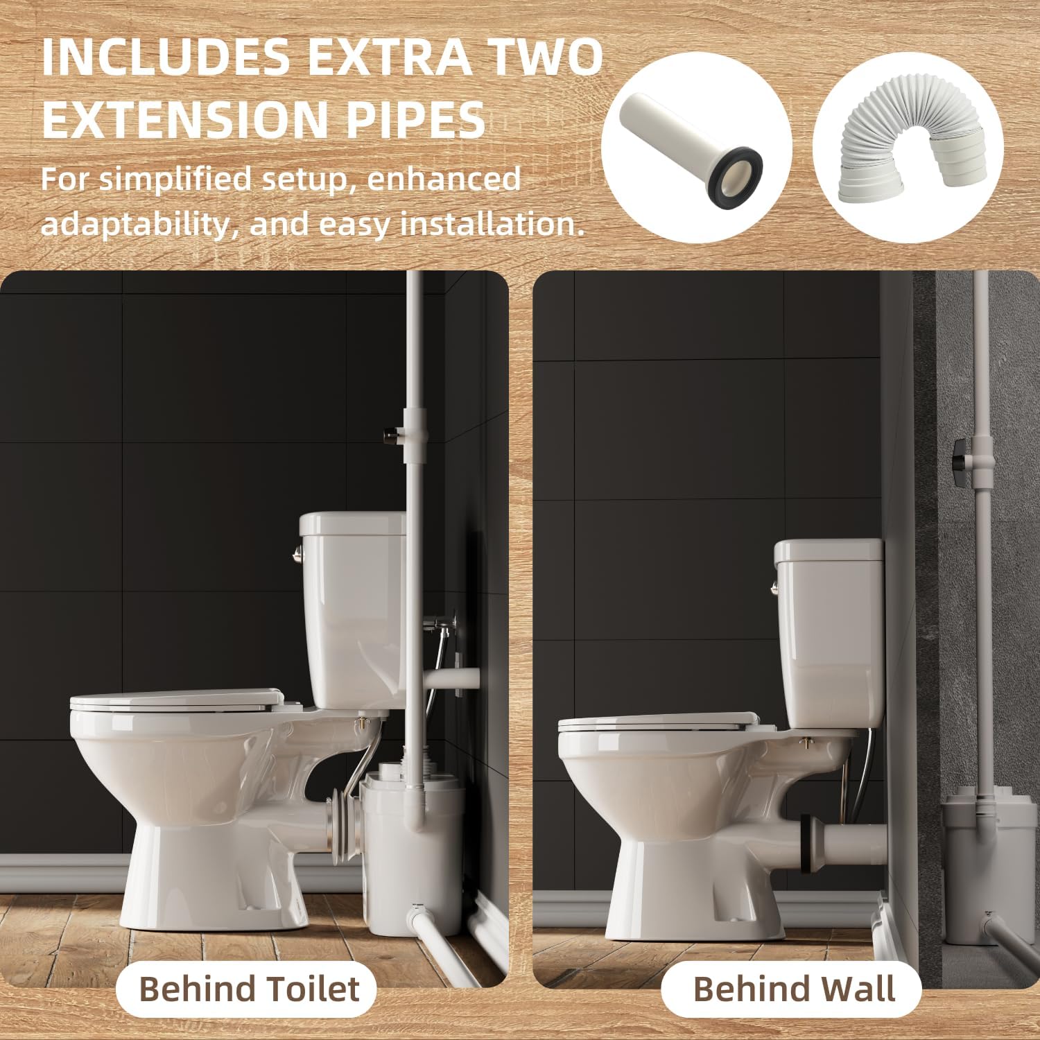 VERSATILE COMPATIBILITY: Equipped with an extension pipe and four water inlets, this toilet system caters to a range of plumbing requirements. It integrates seamlessly with bathroom sinks and showers, making it ideal for basements and other upflush toilet scenarios.