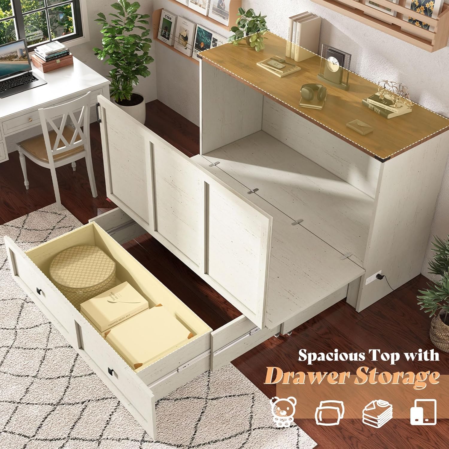 【Practical Storage & Charging】Desktop offers space for decor or workspace, while built-in storage keeps your mattress. The integrated charging station keeps devices powered, and the drawer provides extra storage for pillows