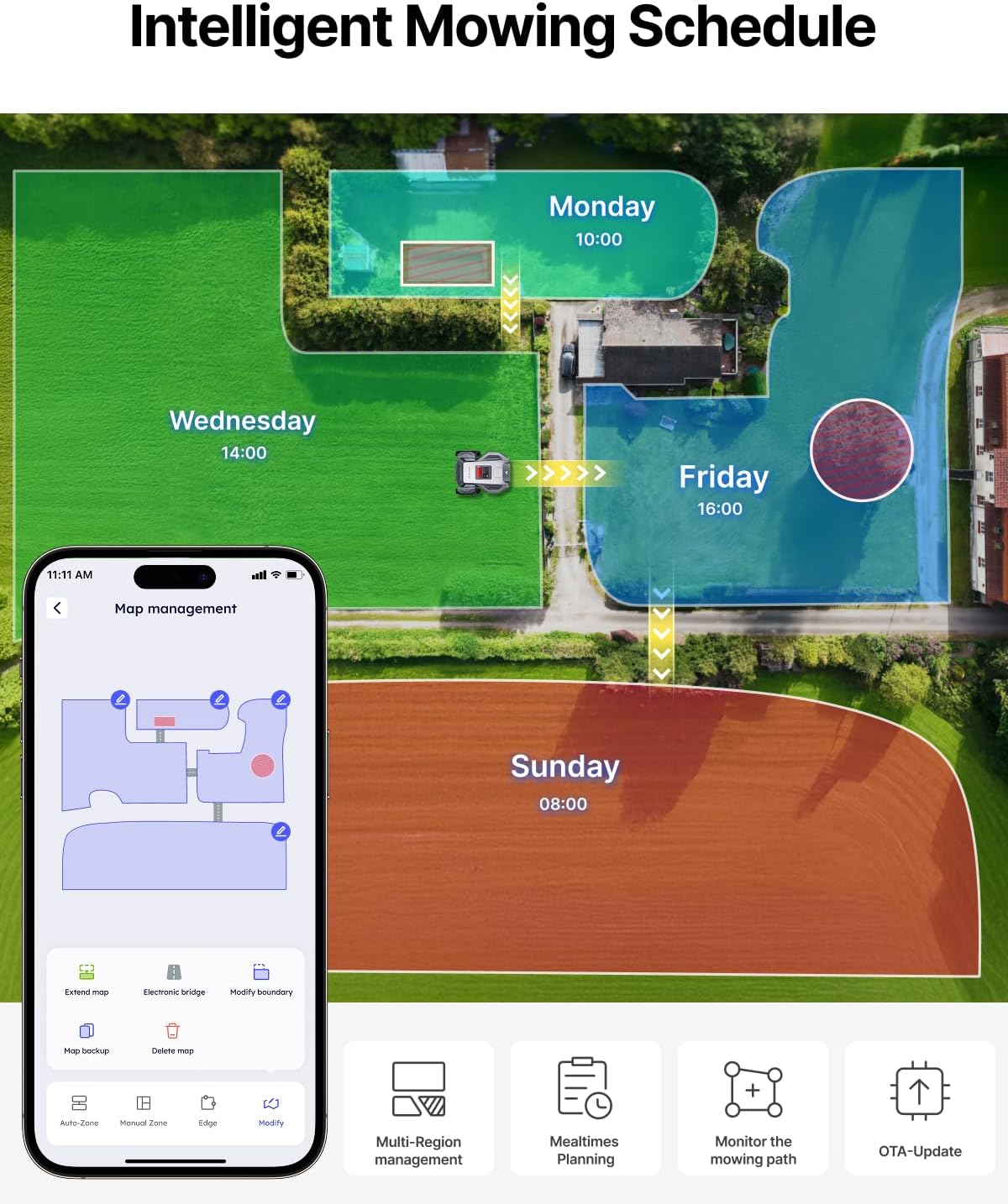 Safety and Quiet Operation: IPX6 waterproof rating withstands heavy rain; operating noise ≤58 dB for quiet operation without disturbing neighbors. Supports OTA wireless updates and emergency braking