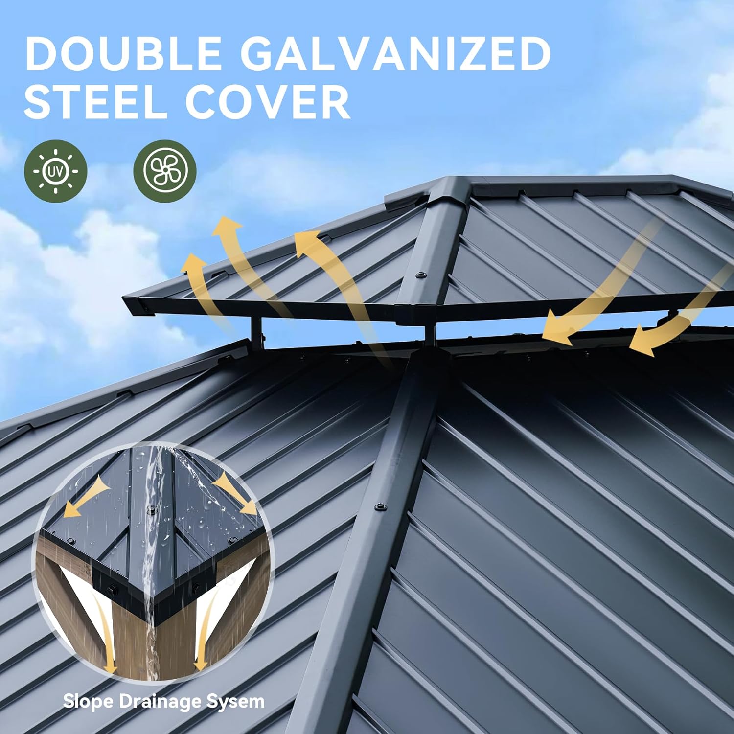 Dual Roof for Comfort: The innovative double roof design promotes airflow, keeping the space cool on hot days. The sloped roof also allows efficient rain and snow runoff, offering year-round protection for a comfortable outdoor experience
