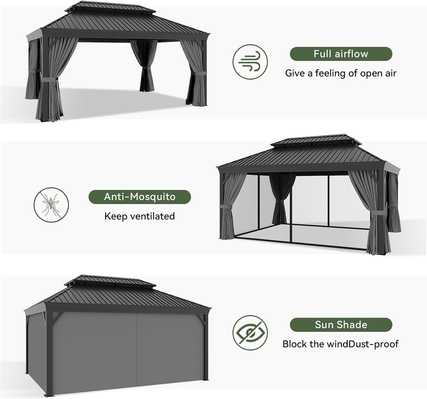 Double Roof:Design with double-layer top, the gazebo can help provide excellent airflow while prevent harmful UV rays. Besides, the sloped roof allows rainwater to slide right off and no worries for rainwater accumulation. The top hooks can hole up to 44lbs