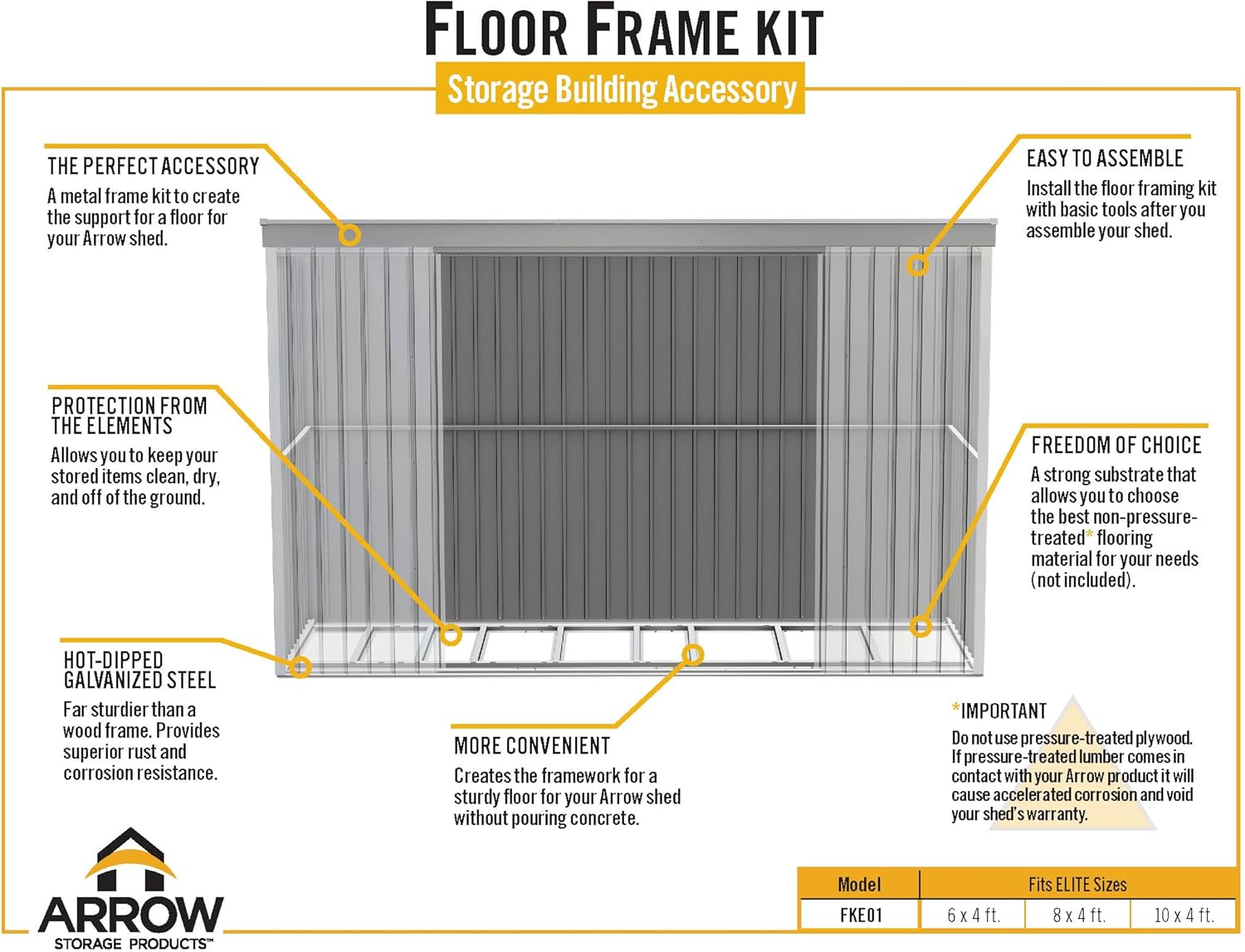 Add a base for your outdoor shed’s floor with the Arrow Floor Frame Kit for Arrow Elite Sheds. This floor framing kit is intended to be installed after your outdoor storage shed has been erected to help create space between the ground and shed floor. It also helps keep your stored items, like garden tools, trashcans, and lawnmowers, off the ground, keeping them clean and dry. The frame will raise the floor above ground level to help with drainage. This heavy duty floor frame is constructed with a hot-dipped galvanized steel for superior corrosion resistance. All necessary parts are included with your shed floor frame kit to install this convenient floor frame. It’s easy to assemble after your shed has been erected with just a few tools, including Philips screwdriver, pliers, work gloves, tape measure, level, and a spade or shovel. The flooring material is sold separately. The Arrow Sheds Floor Frame kit is compatible with Arrow Elite sheds sized 6′ x 4′, 8′ x 4′, and 10′ x 4′. Attach plywood to complete your shed floor. Use 5/8” minimum thickness, exterior grade plywood that has a waterproof adhesive.