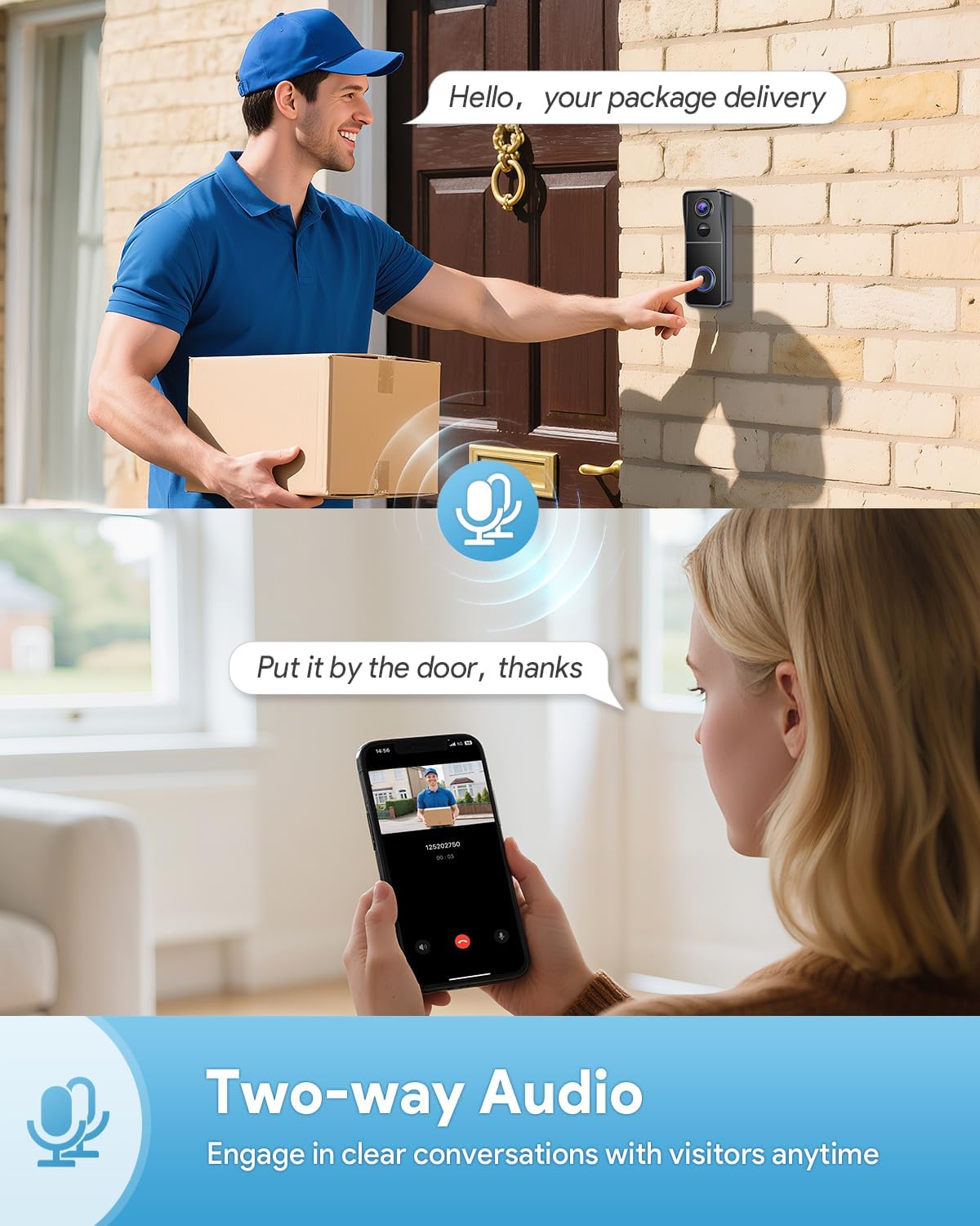【2K Full HD Resolution】See every detail in crisp 2K clarity with this wireless doorbell camera, ensuring sharp, vibrant footage of visitors.