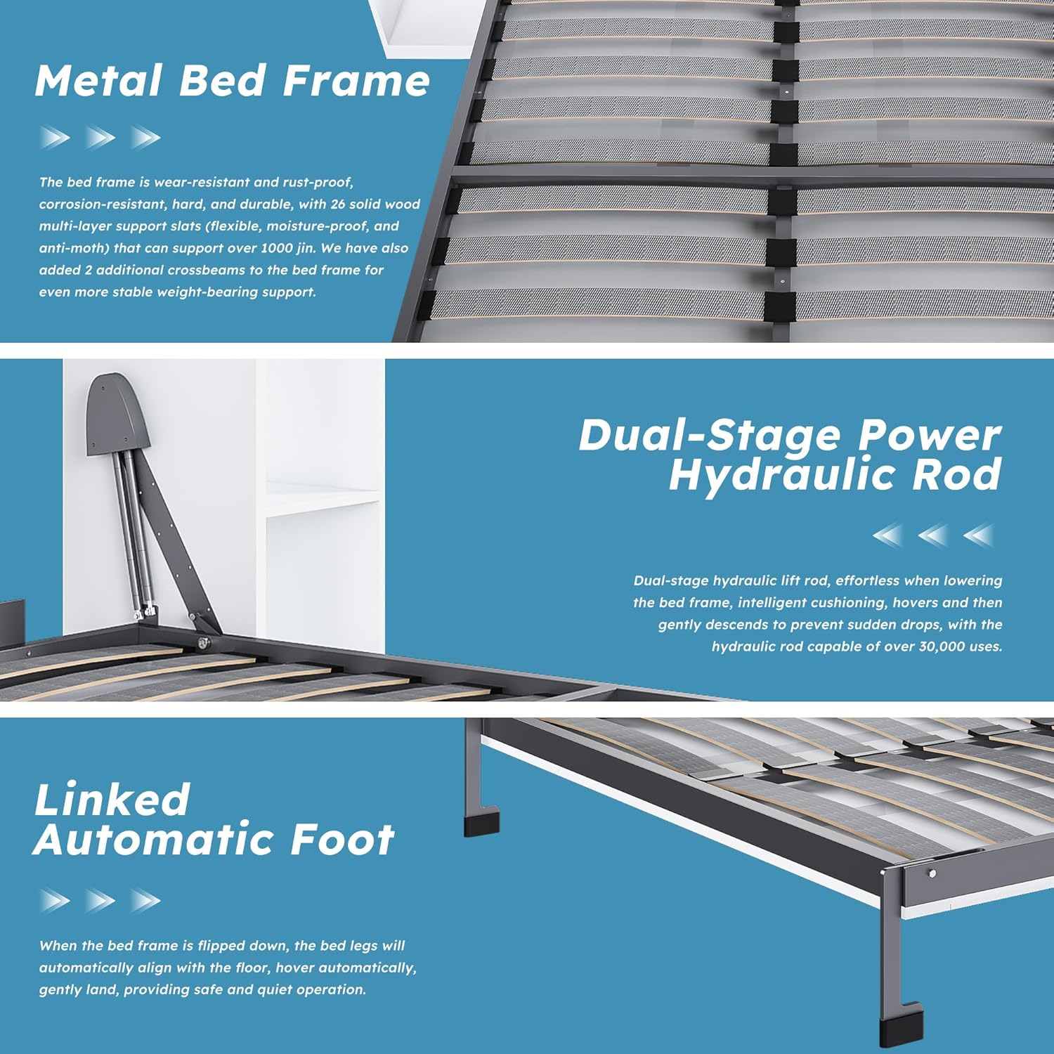 【Robust Platform Bedframe & Safe Operation】:Experience the strength of this murphy bed queen featuring 26 solid wood support slats and a heavy-duty platform bedframe. The two-stage hydraulic system ensures smooth, controlled lowering while automatic feet provide safe landing