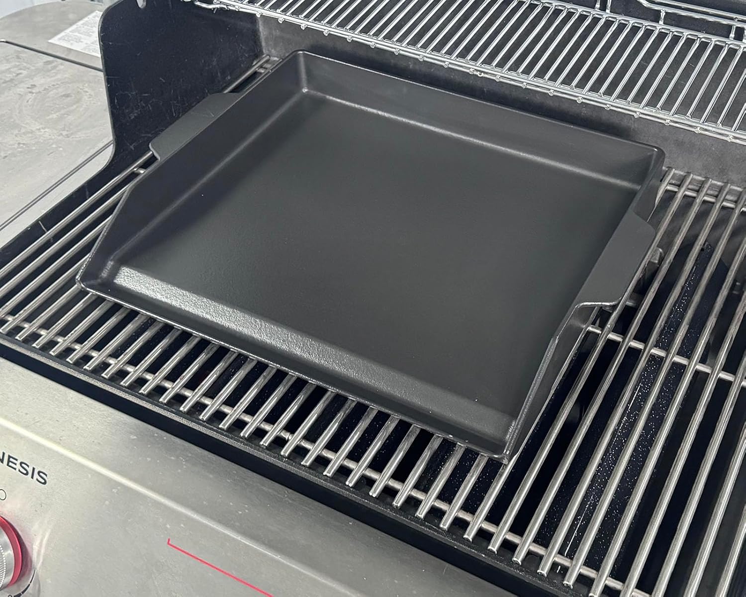 Thoughtful Design for Gas Grill: Convenient Side Handles: With the side handles, this griddle top for gas grill can be easily fixed and moved around. High Sidewalls: Prevent grease stains and food splashes and keep food on the griddle insert for gas grill. Full Width Grease Tray:The grease trough effectively prevents flare-ups and keeps your cooking surface clean
