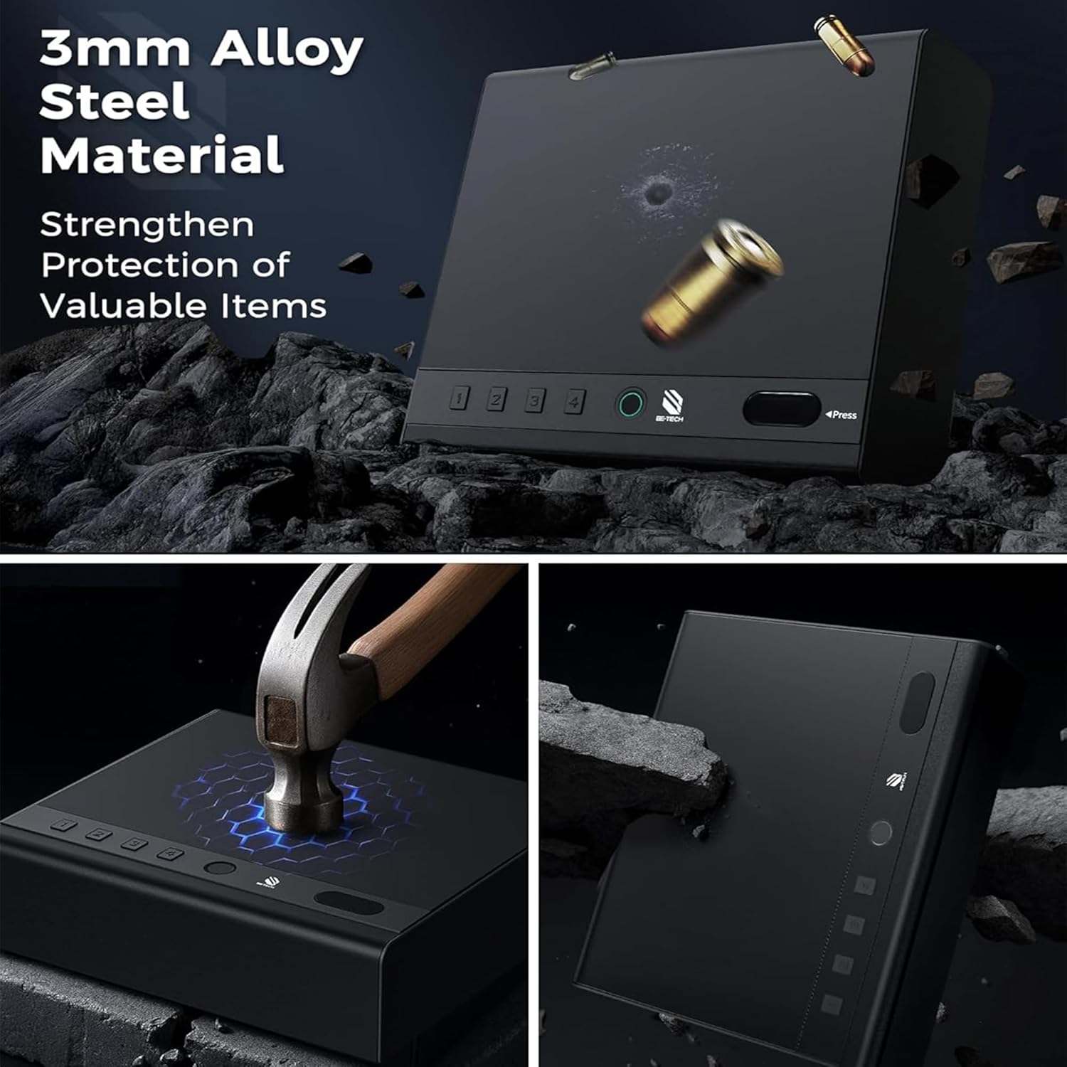 BE-TECH Biometric Gun Safe for Handgun, 3-Way Quick Access Fingerprint Pistol Safe Gun Lock Box, 3 MM Alloy Steel Hand Gun Safes with Cable Sponge for Home, Bedside Nightstand Drawer Bedroom and Car