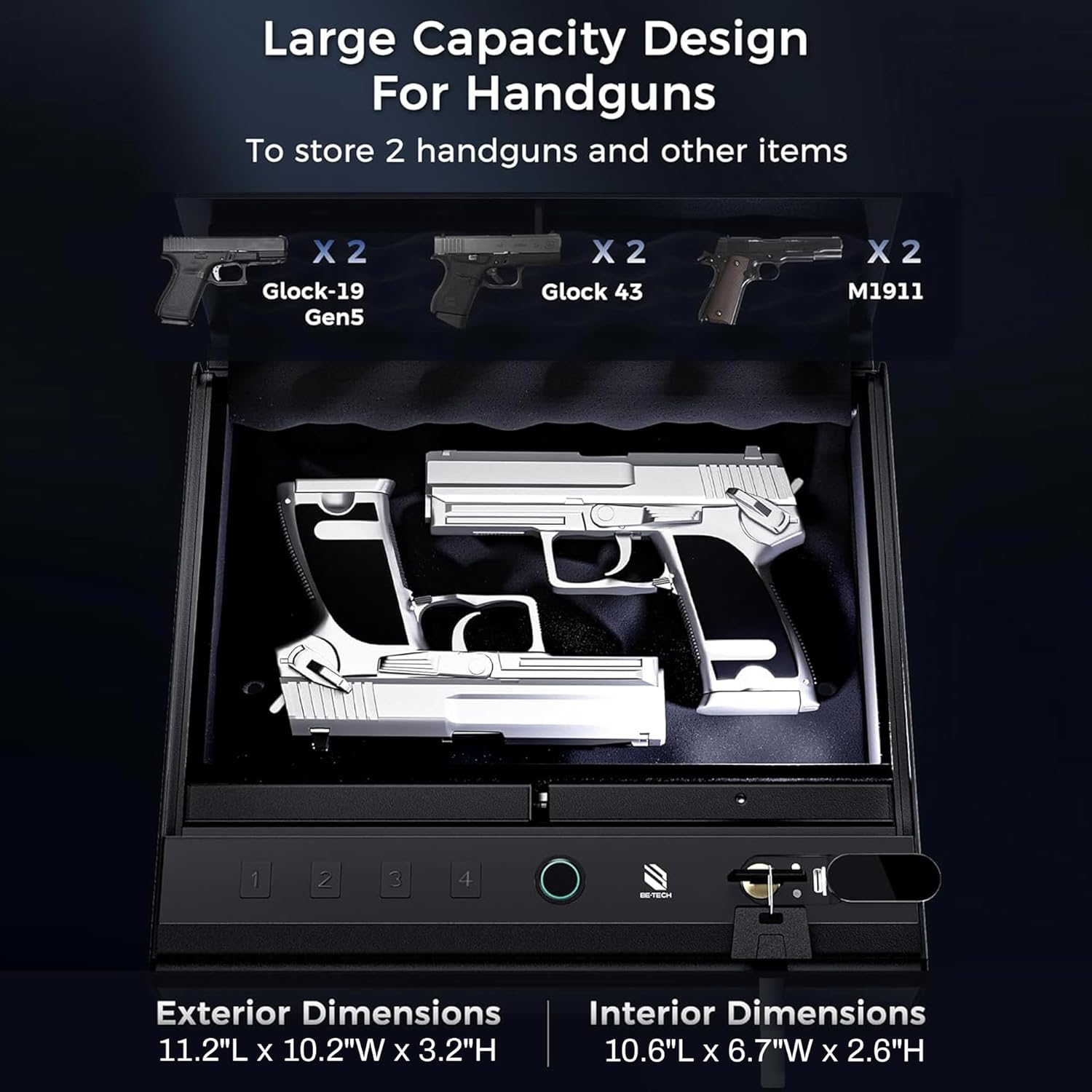 HOLDS 2 FULL-SIZE HANDGUNS – Interior Dimensions: 11.2″L x 10.2″W x 3.2″H. This pistol gun safe spacious interior accommodates large firearms such as two Glock 17s or P365, plus extra magazines and other valuables like jewelry, and features high-quality foam padding to prevent scratches and damage to your items—all in a compact, discreet design ideal for tight spaces