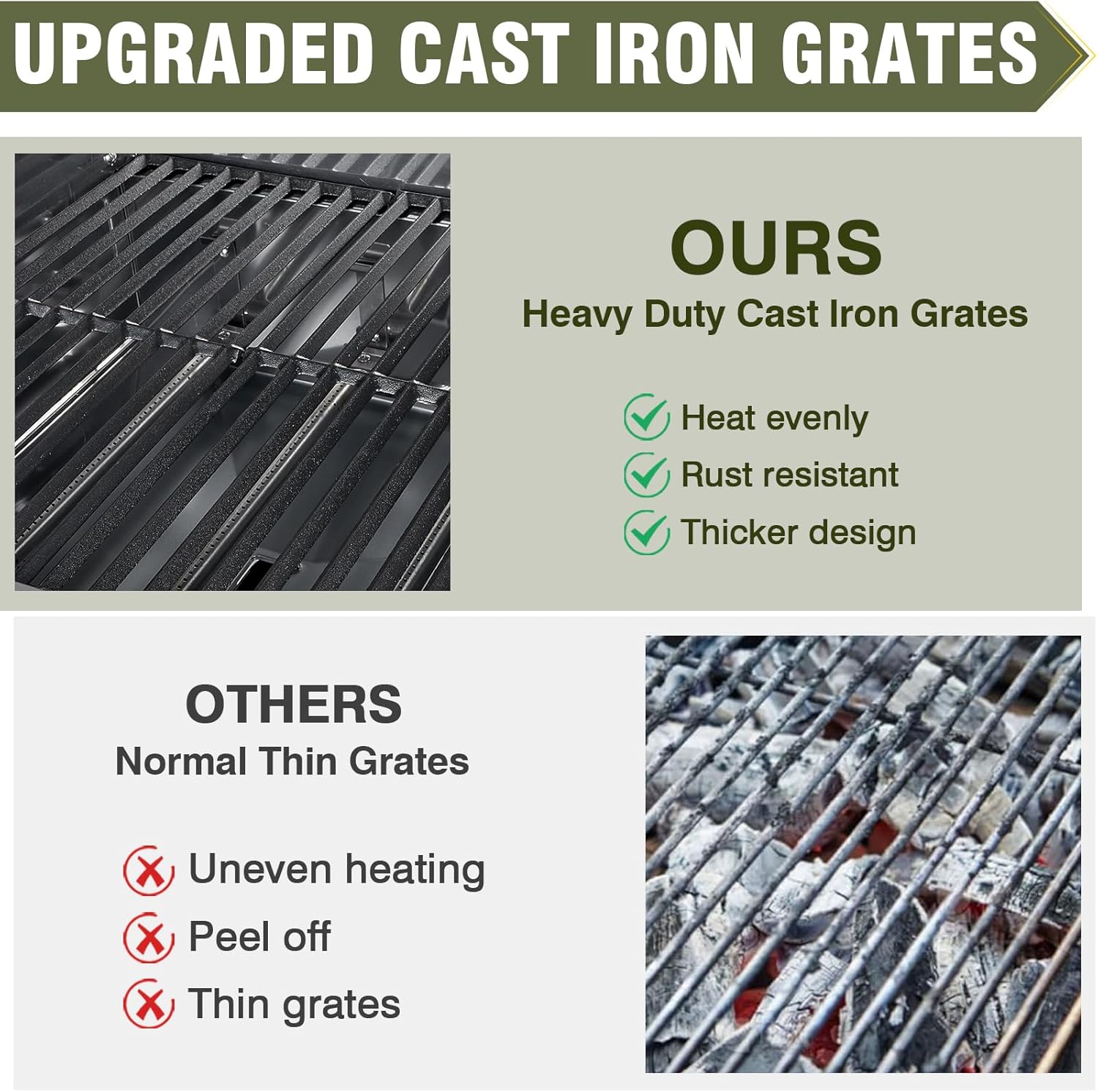 🍔 【Cooking Space】 447 sq in primary area + 200 sq in warming rack fits 40+ burgers. Game-changer: Cast Iron Grates (not flimsy grates!) retain heat 2X longer, create perfect sear marks, and let fats drip cleanly into trays. FREE food clip secures small foods to the plate.