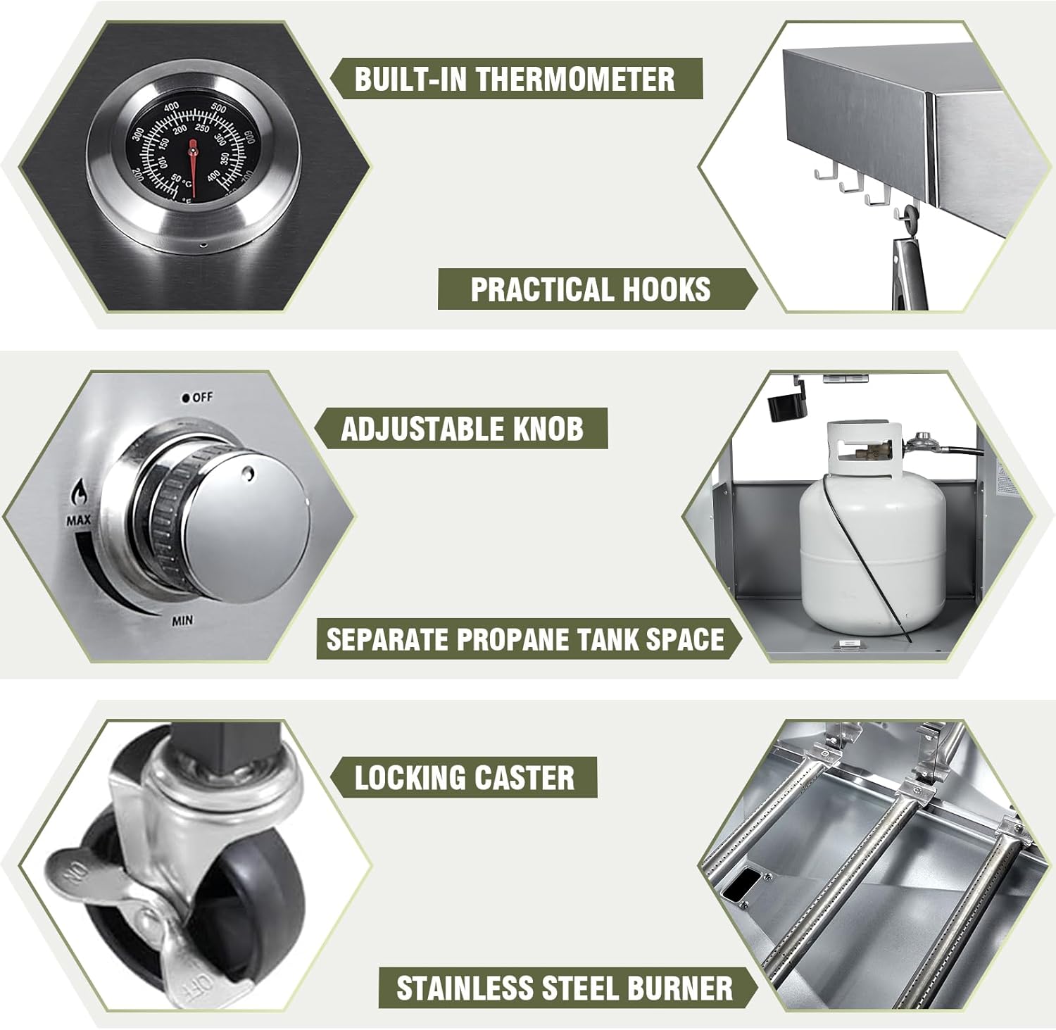 🎁 【Smart Storage + FREE Pro Kit】 Cabinet hides propane tanks; tool hooks organize accessories. BONUS: Get a food clip FREE – pairs perfectly with oil-drain plates to flip foods safely and catch every drip!