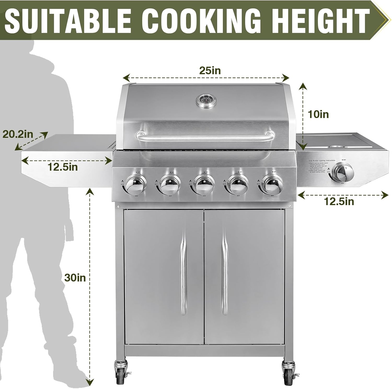 BESTFIRE 68,000 BTU 5+1 Burner Propane Grill – Stainless Steel BBQ with 647 sq in UPGRADED OIL-DRAIN Plates, Cast Iron Grates, Side Burner + FREE Food Clip for Outdoor Cooking