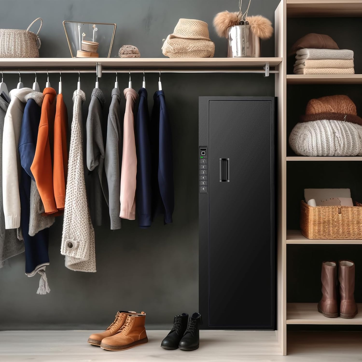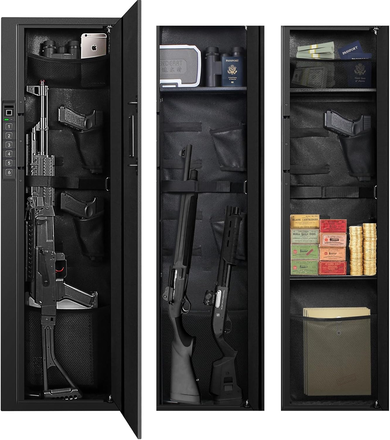 ✅【Hidden RIfle / Shotgun Safe mounted on the wall or Placed horizontally on the floor】 It hold two max guns length of 43″ with or without scopes. Slim Vertical Compact safe stores great behind the door, in a closet, on the wall or inconspicuously in a vehicle. The included removable shelves allow multiple storage configurations depending on desired preferences.