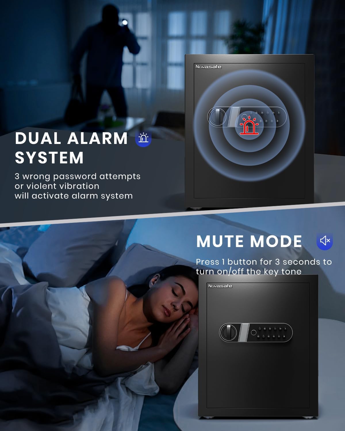 DUAL ALARM SYSTEM: Our cash safe features a double alarm system that activates a loud 70dB alarm in case of three wrong password attempts or violent vibrations. Enter the correct password to stop the alarm. Rest assured knowing that your valuables are well-protected.