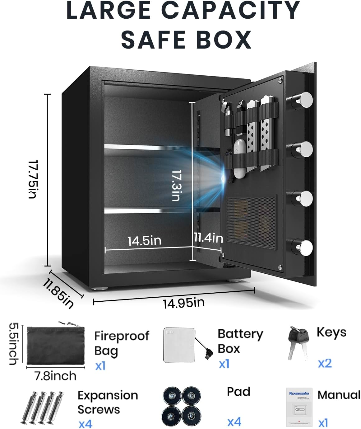 SECURE AND STURDY HOME SAFE: The safe box is crafted with advanced one-piece bending and precision laser cutting technology, thickened pry-resistant door and 4 x 1.1 inch diameter live locking bolts to provide sturdy and reliable protection. Additionally, the safe can be fixed to the wall using the included expansion screws for added protection against theft.