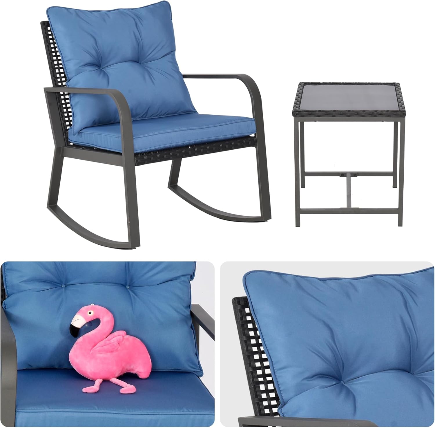 Bistro 3 Piece Patio Furniture Set, Patio Table and Rattan Outdoor Rocking Chairs Set of 2, Outdoor Bistro Conversation Set for Garden, Balcony, Poolside, Backyard, Blue