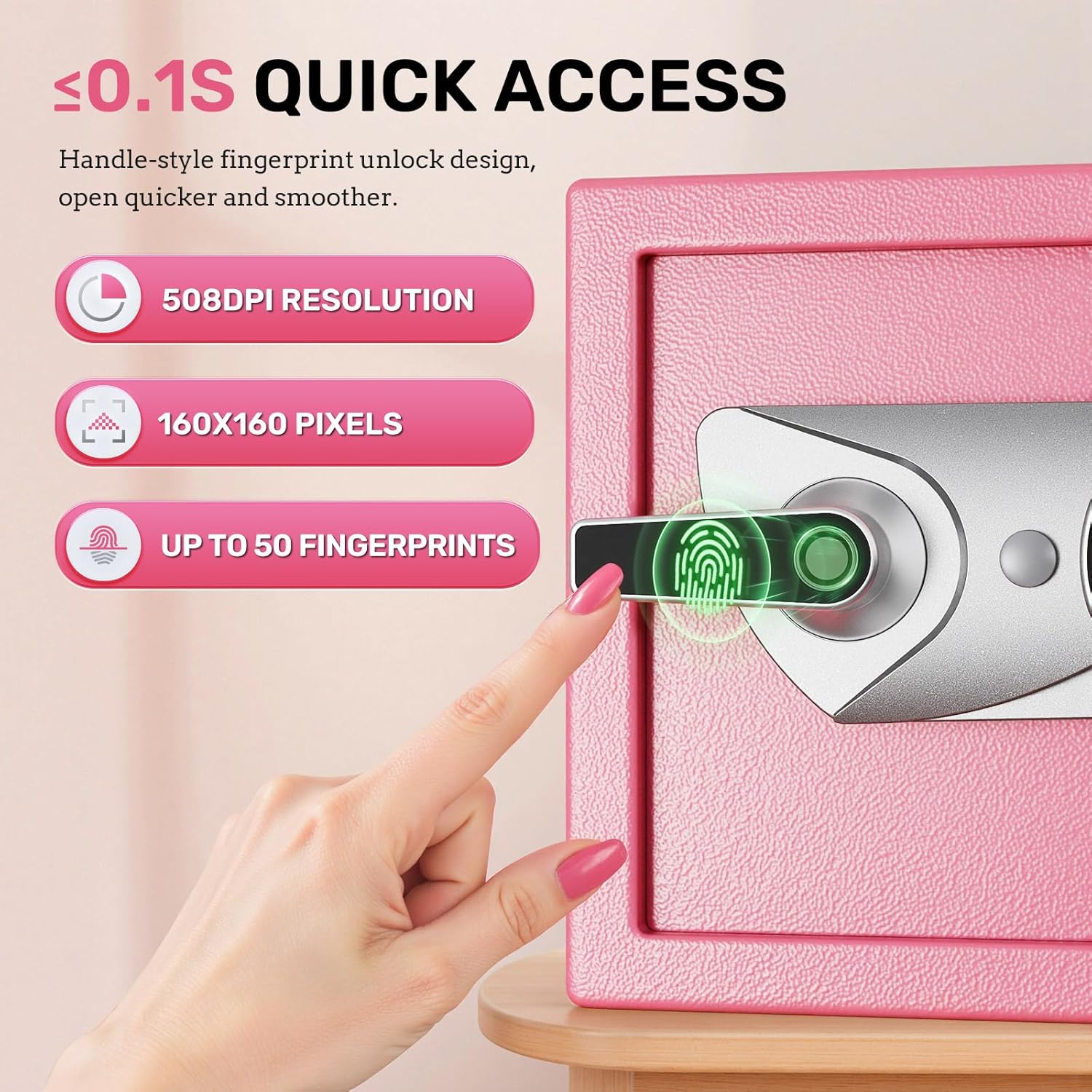 Quickly access in just 0.1s with 160×160 pixels fingerprint recognition and 508 DPI scanner.Store up to 50 fingerprints for access home safe by multiple users.