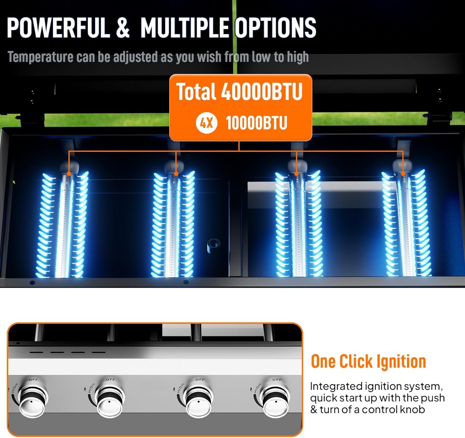 Powerful 40,000 BTU Heating with Precise Control: Equipped with four 10,000 BTU burners, this grill generates 40,000 BTU of even heat for fast preheating. Independent temperature knobs let you create different heat zones—sear meats on high or slow-cook veggies on low. The one-click electronic ignition ensures reliable starts every time, making it easy for both beginners and seasoned grillers to achieve restaurant-quality results.