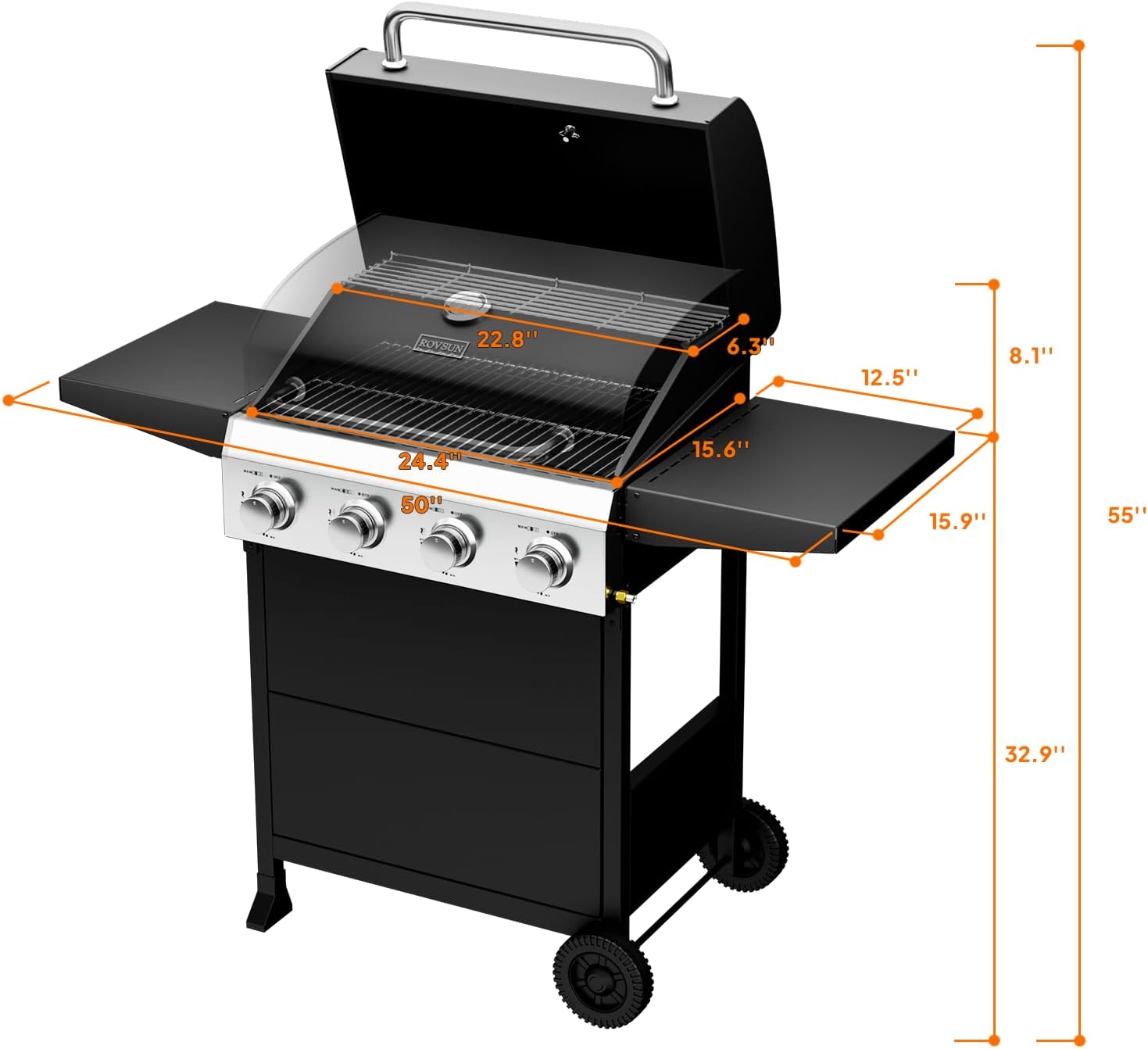 Bonnlo 4 Burners Portable Gas Grill with Enameled Cast Iron Grates, Powerful 40,000 BTU Propane Grill with Side Shelf & Bottom Cabinet, Outdoor Grill with Wheels for Patio Backyard Garden BBQ Use