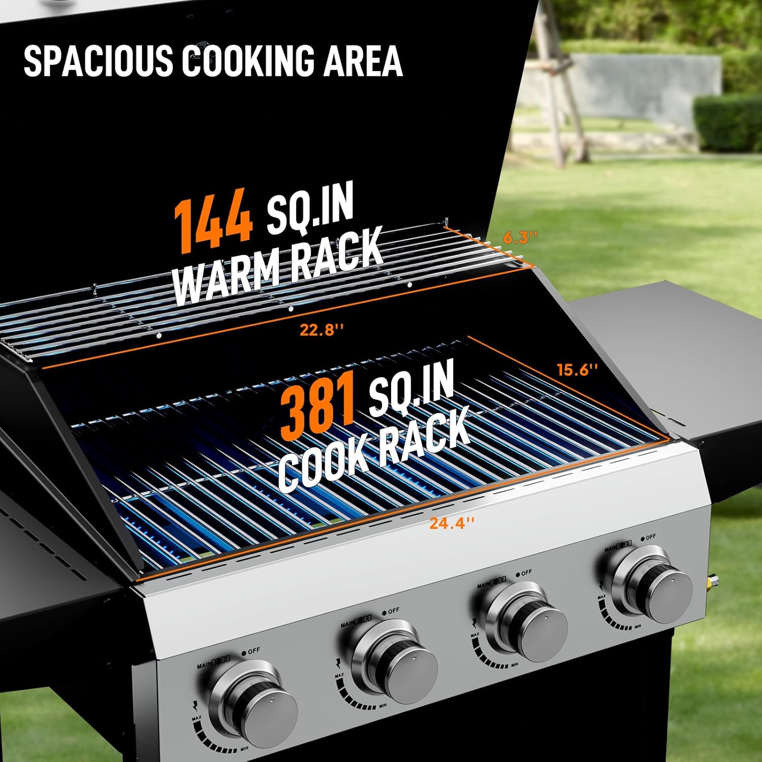 Spacious Cooking Area: The gas grill has 525 SQ Inch cooking areas and side tables( 381 square inches for cooking & 144 square inches for warming). Whether it’s multiple courses of grilled meats for a family dinner, a seafood and vegetable feast for a friend party, or the simultaneous grilling of all kinds of ingredients at a large BBQ, it can all be accommodated with ease, eliminating the awkwardness of “grilling in batches and waiting repeatedly”