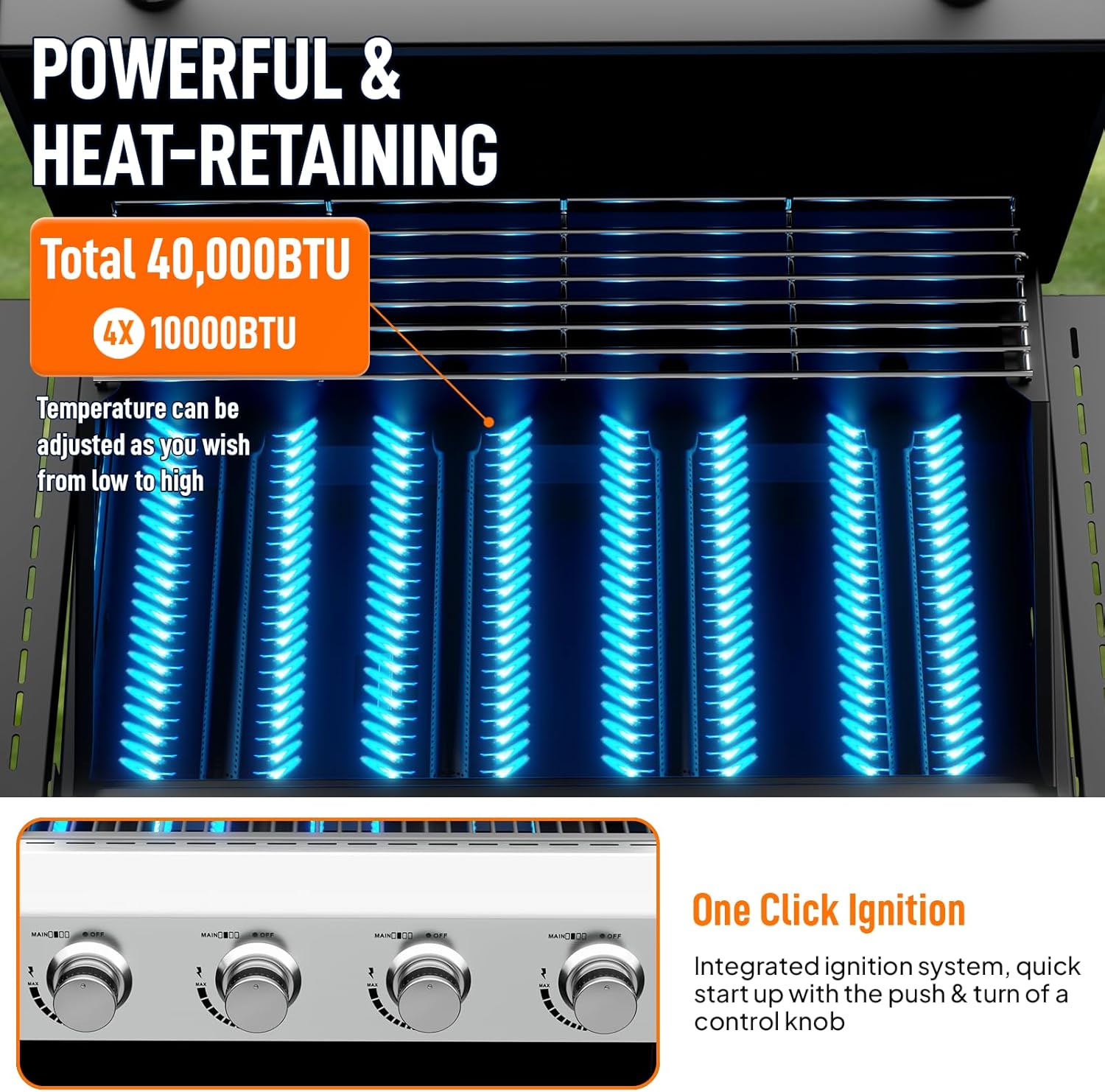 This is an all-in-one outdoor barbecue stove that combines rapid heating, large space, portable folding design, easy cleaning, and safe enamel coating.It is equipped with two burners and total 40,000 BTU high-power burner for quick ignition and heating, eliminating the need for long preheating. It has a 381 square-inch main cooking rack and 144 square-inch insulation rack. The food-contact-grade enamel surface coating is heat-resistant, wear-resistant, safe, and odor-free, ensuring food safety from the source.Whether you are a beginner at barbecuing or a food enthusiast, you can easily unlock delicious outdoor feasts with it.