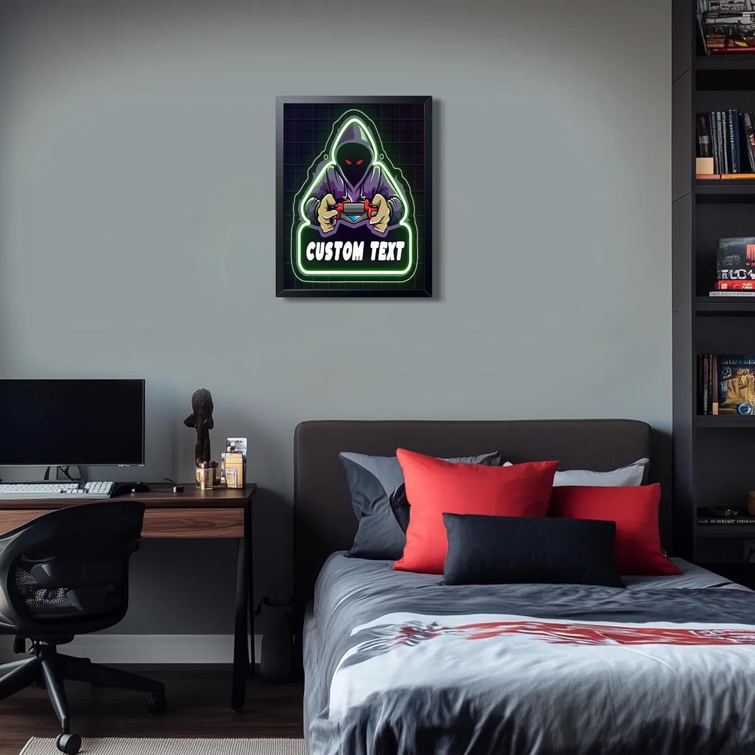 1. Bold Neon Gamer Design Wall Art Features a cool hooded gamer holding a glowing controller in vibrant neon style. Perfect for boys room decor, adding energy and personality to any gaming-themed space.