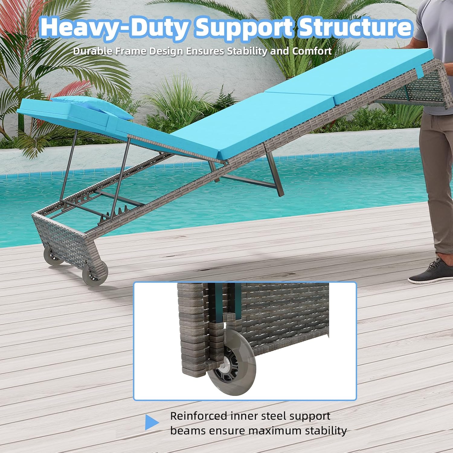 Adjustable Reclining Backrest: Customize your comfort with the multi-angle reclining chaise lounge, ideal for sunbathing, reading, or napping. The ergonomic design features a thick 2.36″ cushion (600GSM high-density foam) and removable, zippered covers for easy cleaning