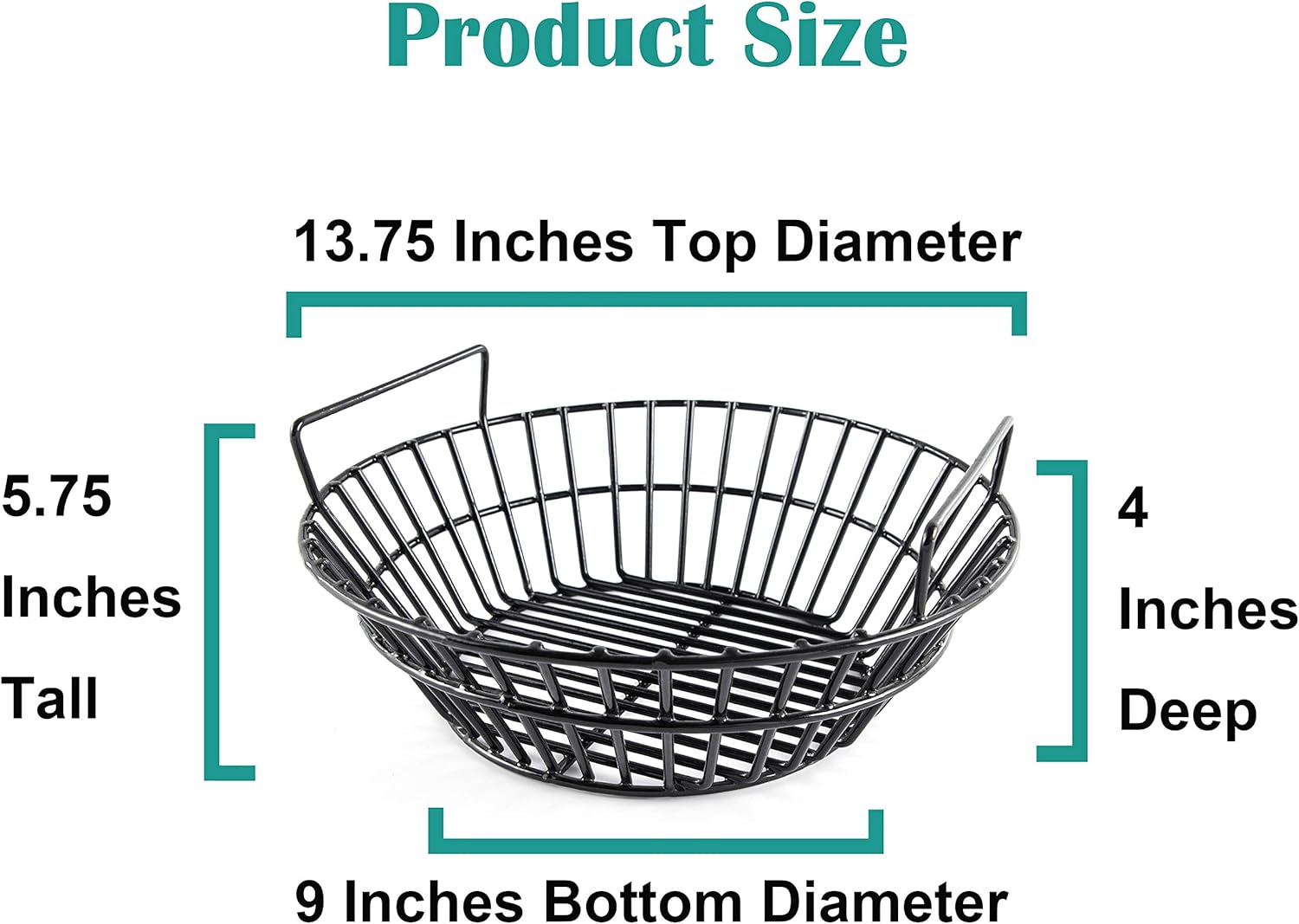 【Dimensions】13.75″ Top Diameter, 9″ Bottom Diameter, 5.75″ Tall and 4″ Deep. Please check your smokers/grills’ dimensions before you buy the basket.