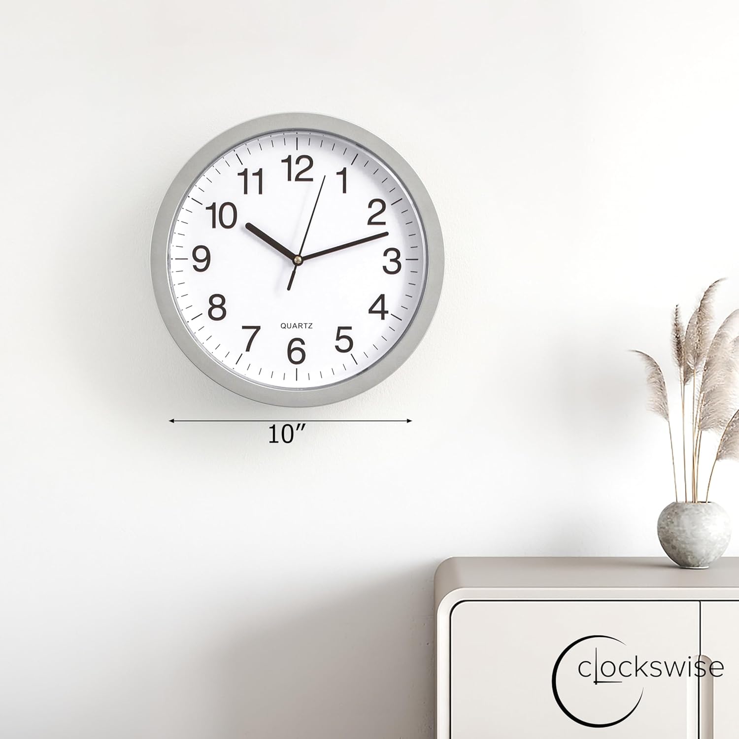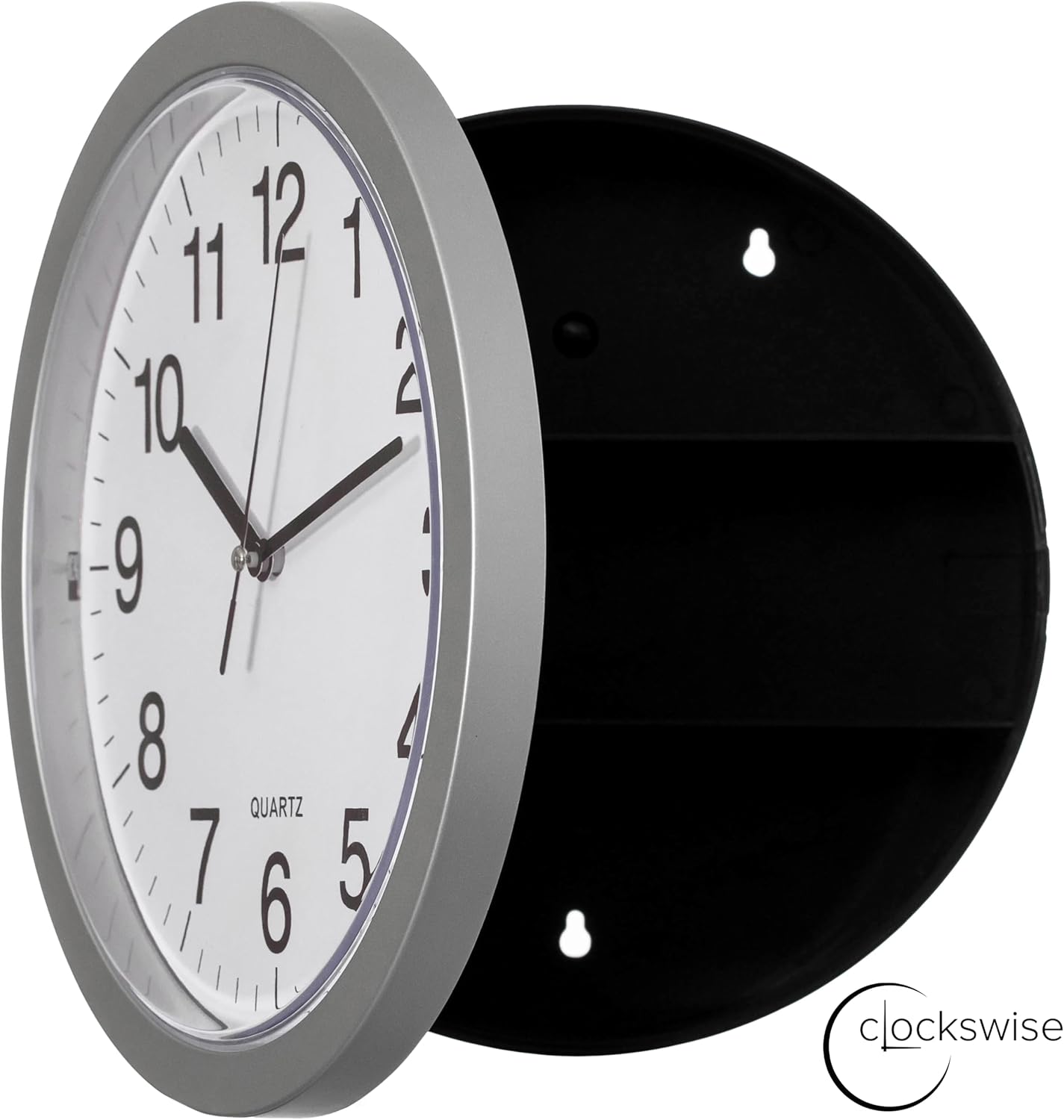 Clockswise 10in Wall Mounted Clock with Hidden Storage Door Stylish Safe for Valuables Featuring Secret Interior Compartment Diversion Box for Kitchen, Living Room Decor and Home Organization (Silver)