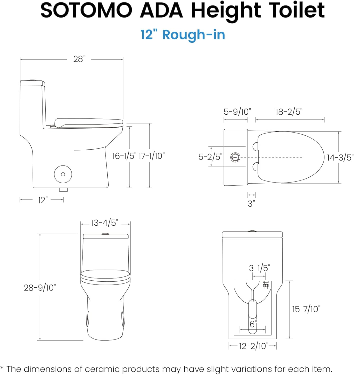 What You Get:The package includes the ADA compliant toilet,soft-close toilet seat, pre-installed flush valve, premium wax ring, floor bolts, toilet tank lid, side cover sets and installation instructions. A 12-month worry-free warranty, and our life-time friendly customer service form SOTOMO are also included.