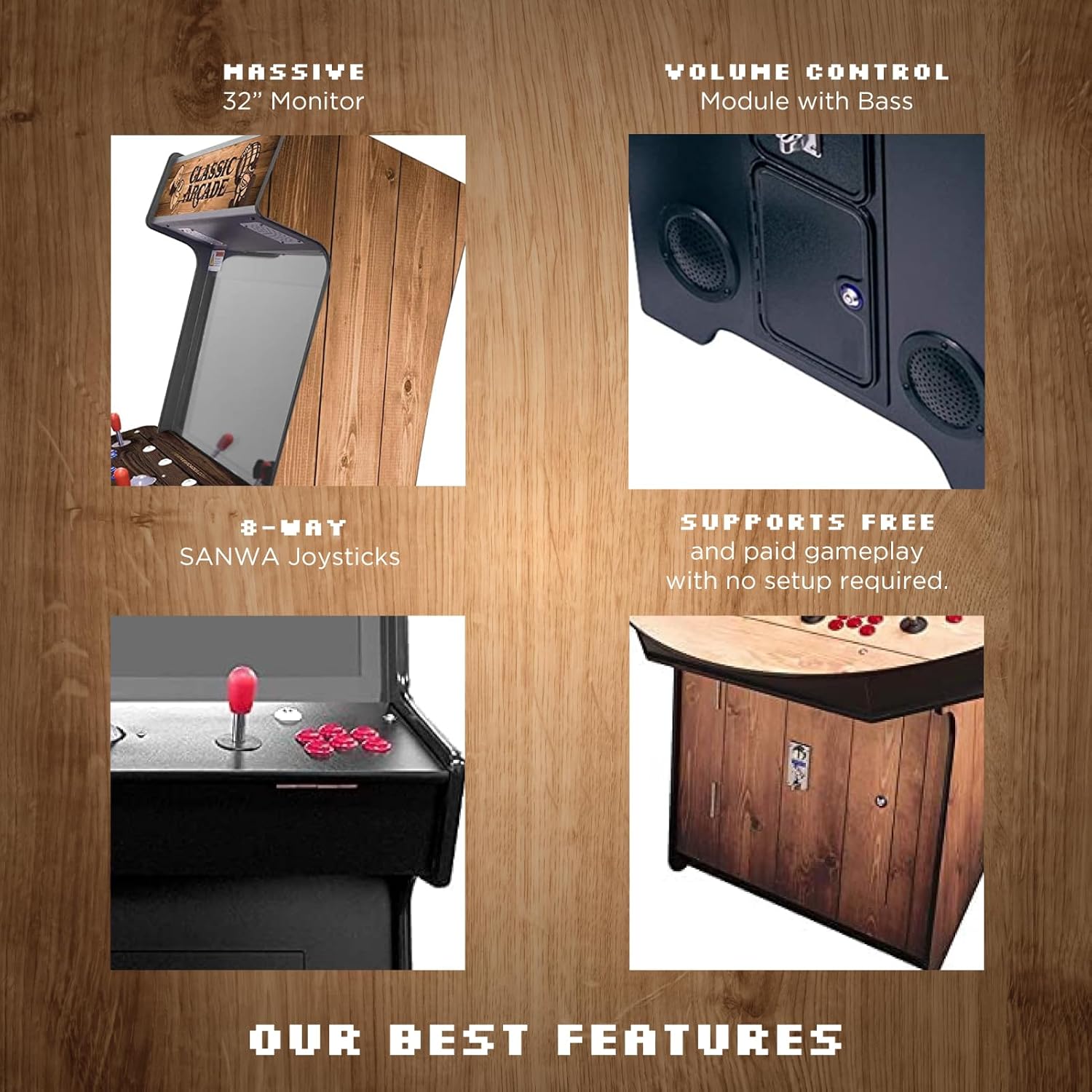 FULL-SIZE COMMERCIAL GRADE: Equipped with the Highest Quality SANWA Joysticks, Trackball, 32″ LCD Monitor, Thick Tempered Glass, and more! We stand behind our products because we are industry leaders in quality craftsmanship and design.