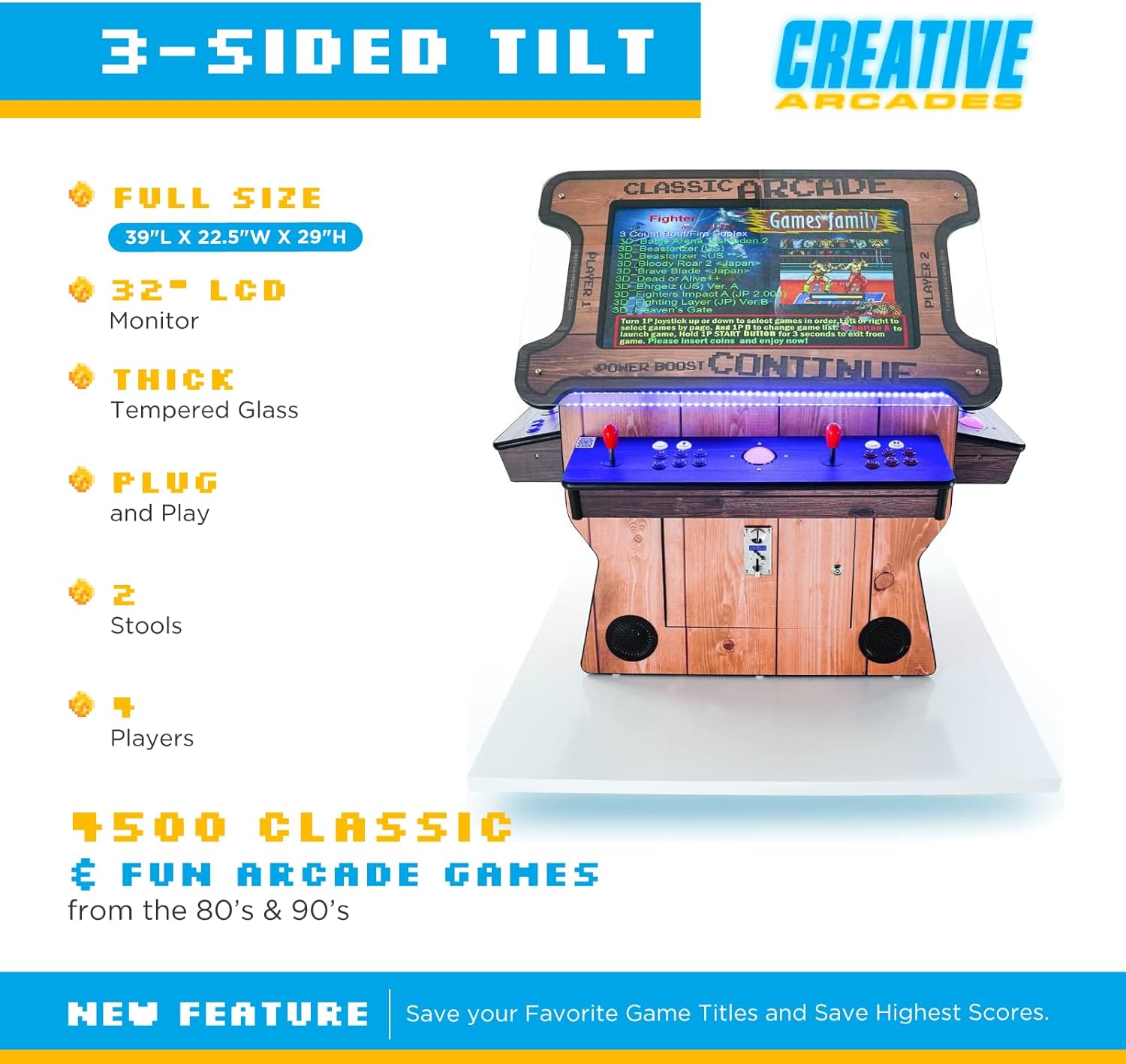 4500 CLASSIC GAMES INCLUDED: Feel like a kid again while playing the pre-installed 80’s and 90’s classic games! Whether playing for fun or competitively with your friends and family, this arcade machine is guaranteed to be a big hit!