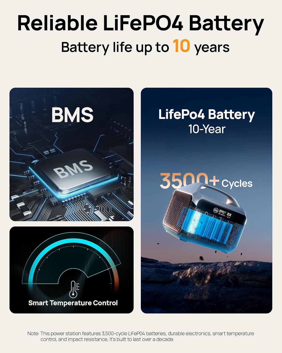 【Advanced LiFePO4 Battery with 3500+ Cycles】Built with high-quality LiFePO4 cells that last up to 10 times longer than standard lithium-ion batteries. Equipped with a smart Battery Management System (BMS) that protects against overcharging, overheating, and short circuits for long-lasting, safe use.