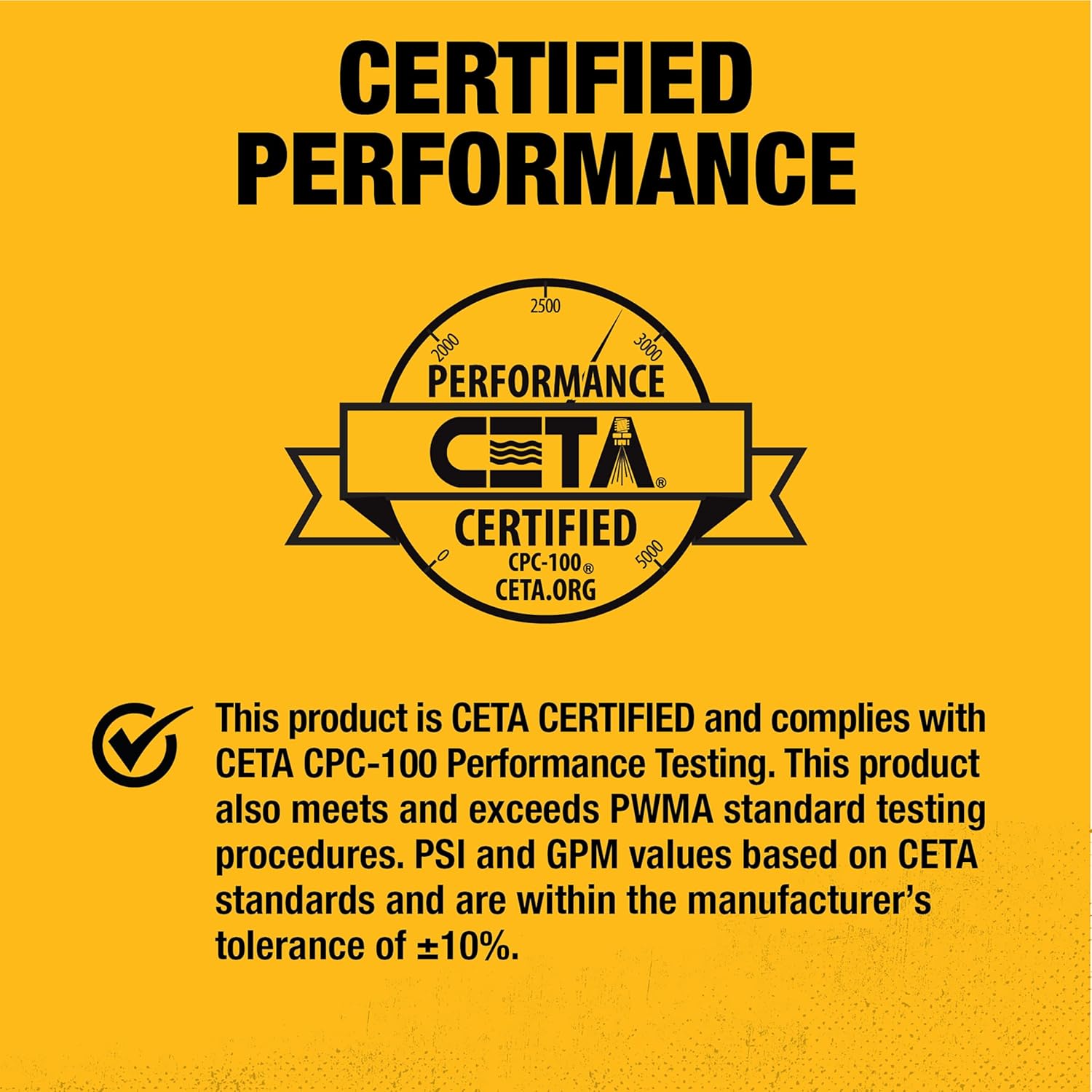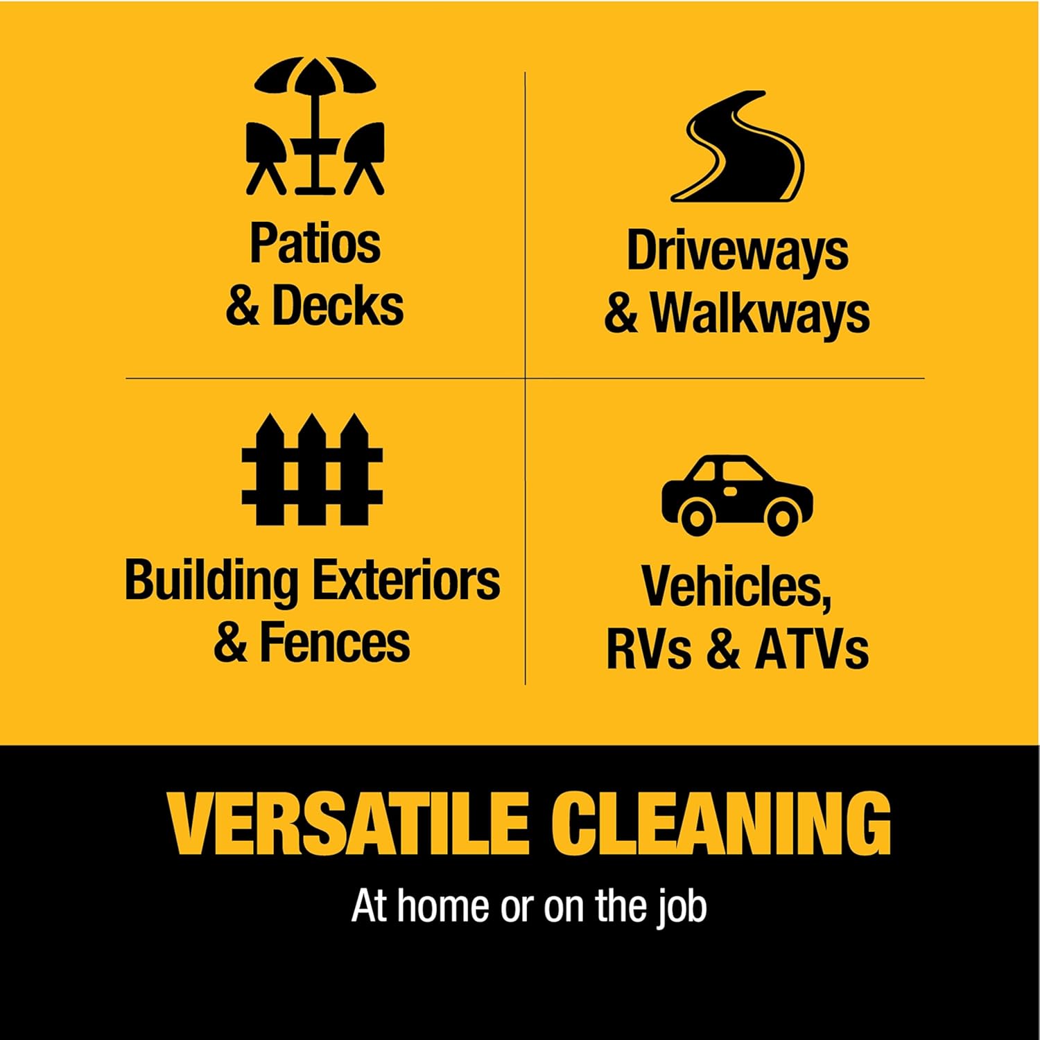 Start faster and clean smarter with the DeWalt DXPW3400PRNB-S PressuReady 3400 PSI, 2.5 GPM gas pressure washer. Squeeze the trigger to engage the battery-powered Quick Start, no choke or pull cord, and it auto-shuts off after brief inactivity to save fuel and reduce noise. A durable OEM Technologies axial cam pump and 208cc engine deliver steady pressure for patios, decks, siding, and outdoor furniture, with a thermal relief valve to help prevent overheating. The compact, welded steel frame and 10″ pneumatic tires simplify transport, while the PressuReady smart control panel shows ready/water-flow status plus low-fuel/low-battery alerts. Includes MorFlex 1/4″ x 25′ hose, ergonomic spray gun with 16″ steel wand, and five quick-connect nozzles (0°, 15°, 25°, 40°, soap). Compatible with DEWALT 20V MAX* and FLEXVOLT batteries (sold separately). 49-state compliant cold-water design built for reliable residential power washer cleaning.