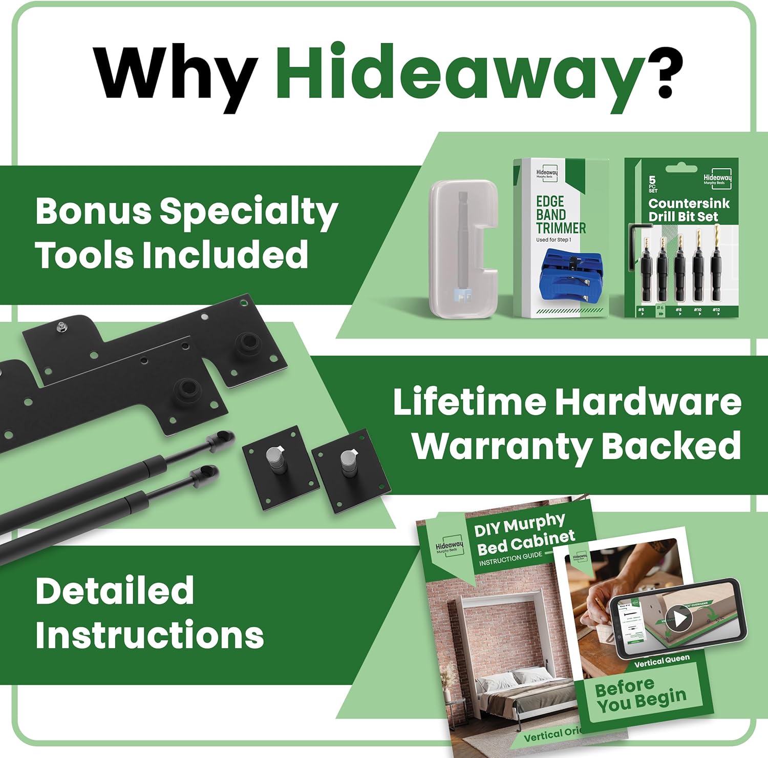Hideaway Includes Specialty Tools You’d Have to Purchase Elsewhere: An edge band trimmer, and forstner & countersink drill bits are required for any queen size murphy bed cabinet DIY kit. We’re the only ones that include them – saving you money!