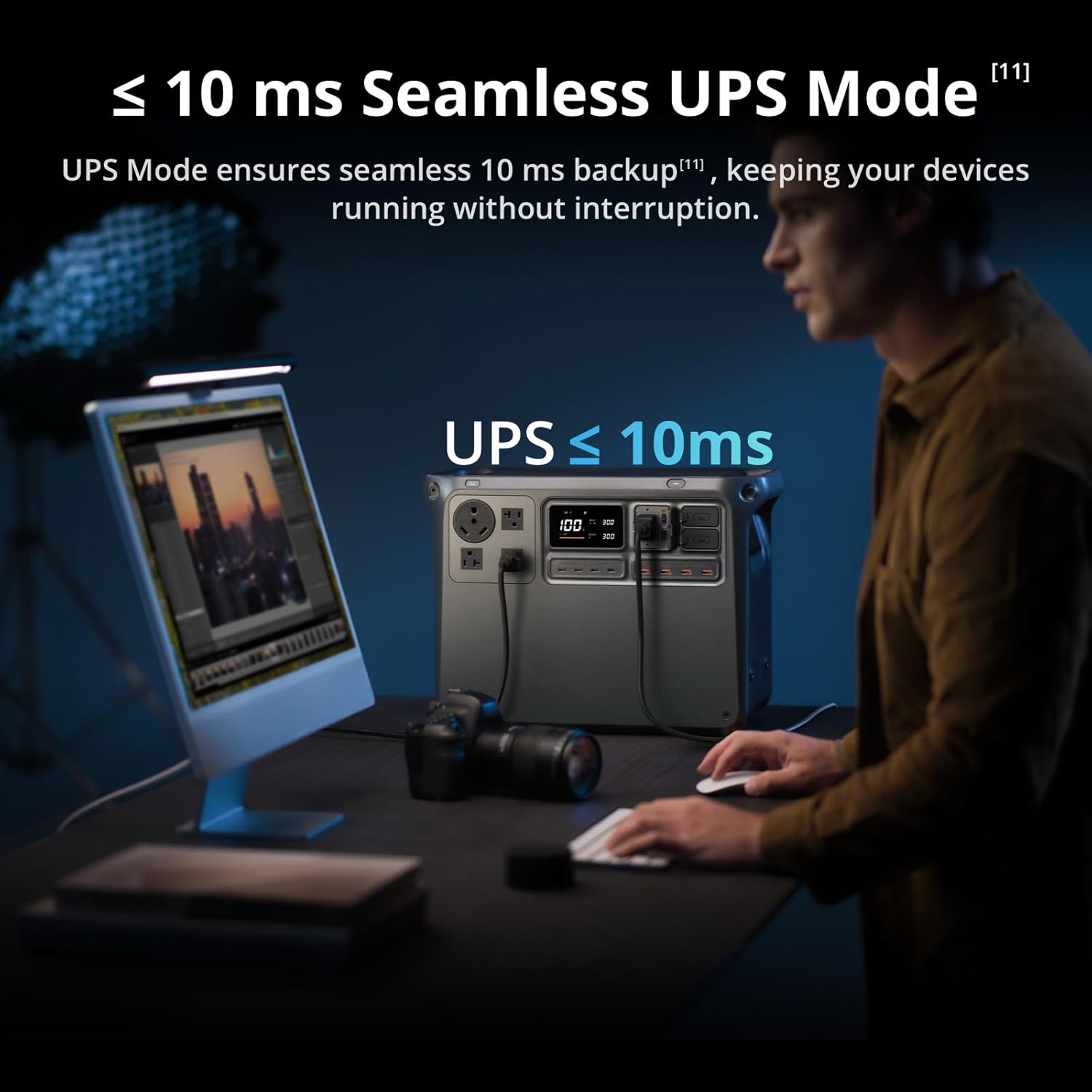 Reliable Power Station in a Flash – DJI Power 2000 features seamless UPS with a 10 ms [11] switch time—twice as fast as Power 1000—keeping your devices running smoothly during unexpected outages.