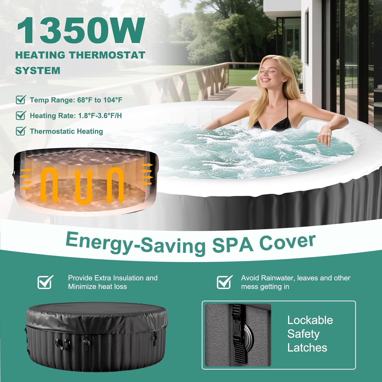 BUBBLE JETS MASSAGE: Indulge in supreme relaxation with the inflatable hot tub, boasting 120 air jets and providing a gentle massage experience for 2-4 people to comfortably enjoy the relaxation and soothing warm hydrotherapy; Do not use the heating and massage bubble functions together, as it will affect the heating effect. It is recommended to use the massage function after heating