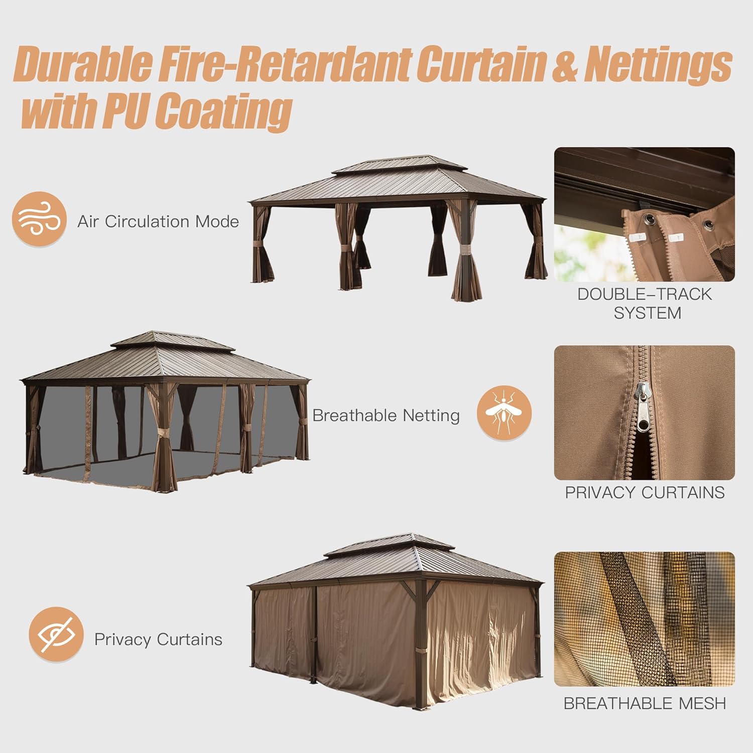 Domi 14′ X 22′ Hardtop Gazebo Outdoor Metal Gazebo Canopy with Galvanized Steel Double Roof, Aluminum Frame, Curtains and Netting for Patio, Deck, Garden, Brown